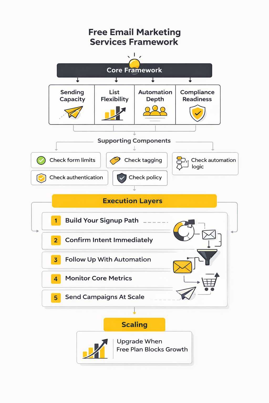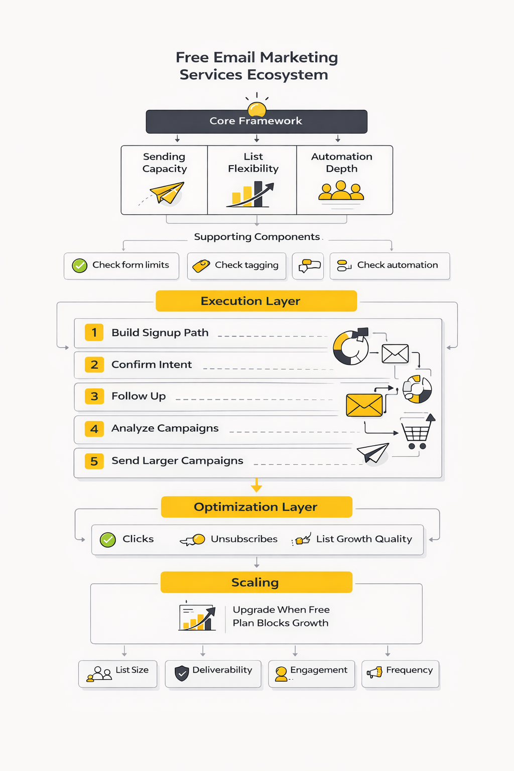 A practical way to evaluate free email marketing services is to score every platform across four areas: sending capacity, list flexibility, automation depth, and compliance readiness. Sending capacity tells you how much momentum you can build. List flexibility tells you whether you can grow without hitting a wall too early. Automation depth tells you whether you can do more than blast newsletters. Compliance readiness tells you whether the platform helps you send in a way inbox providers will keep accepting.
