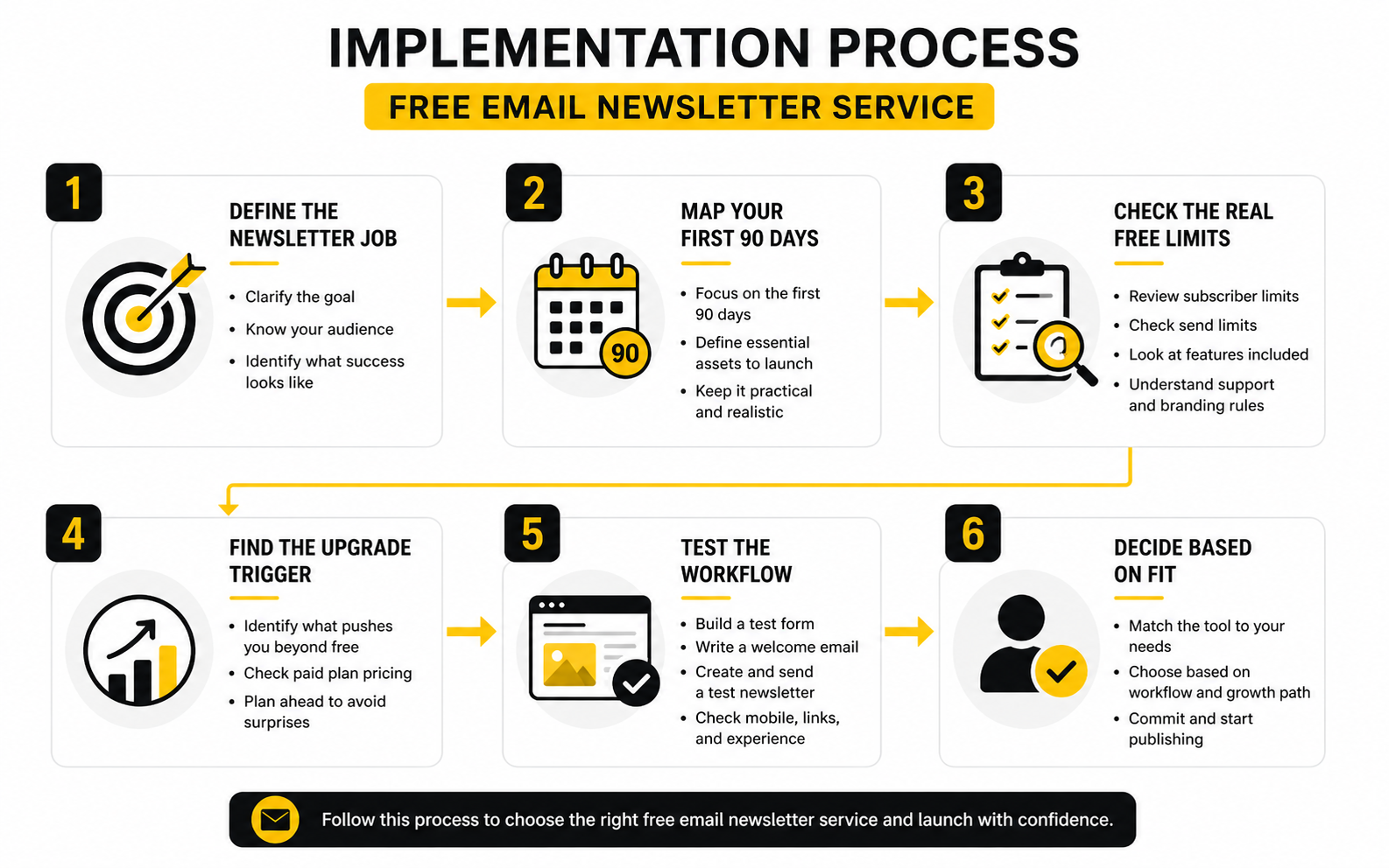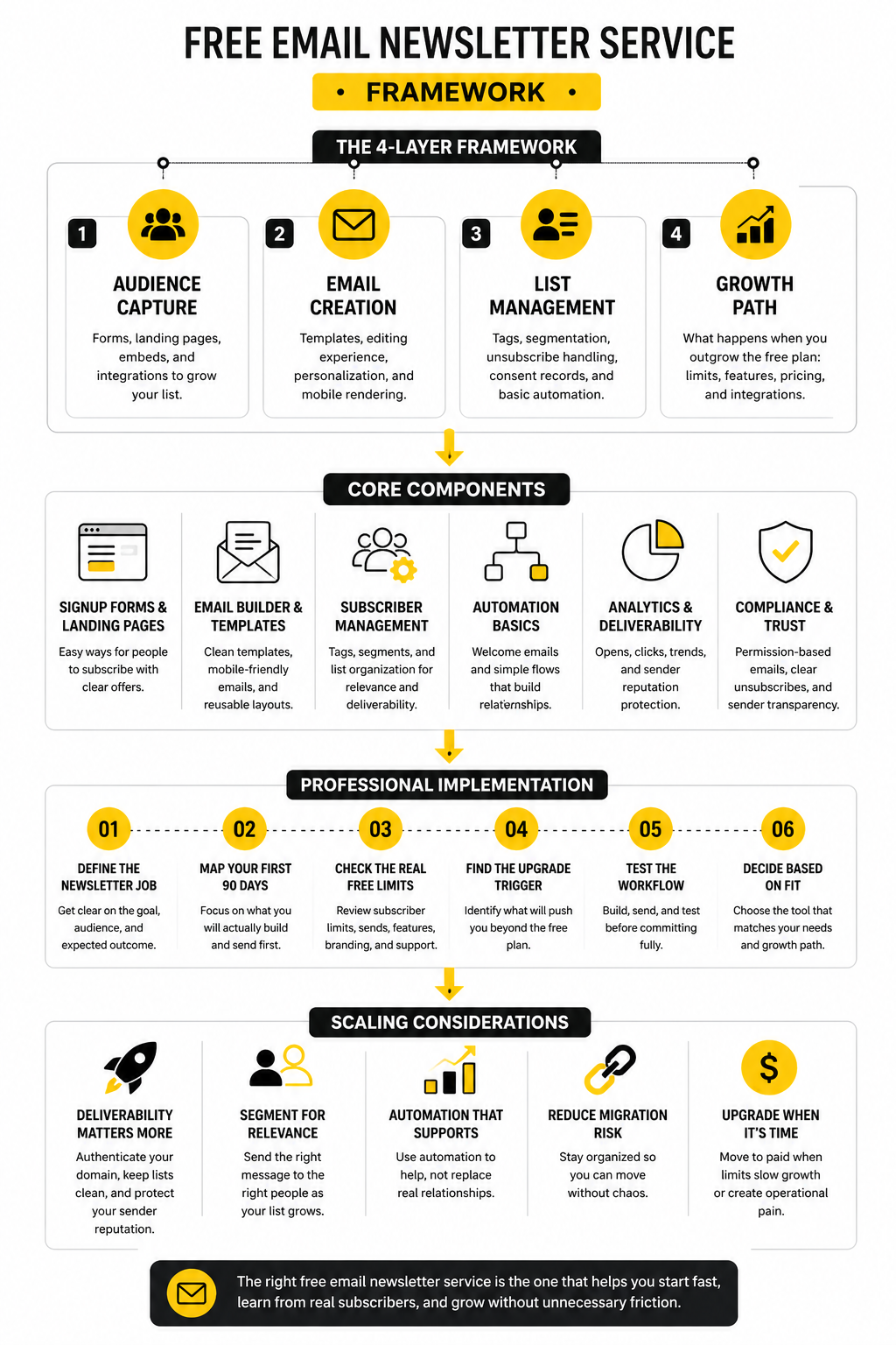 A free email newsletter service works best when it sits inside a simple system. You need one clear signup promise, one clean capture flow, one reliable sending rhythm, one basic measurement loop, and one upgrade path that will not punish you later. That is the final system: not a random tool, but a workflow you can keep improving.