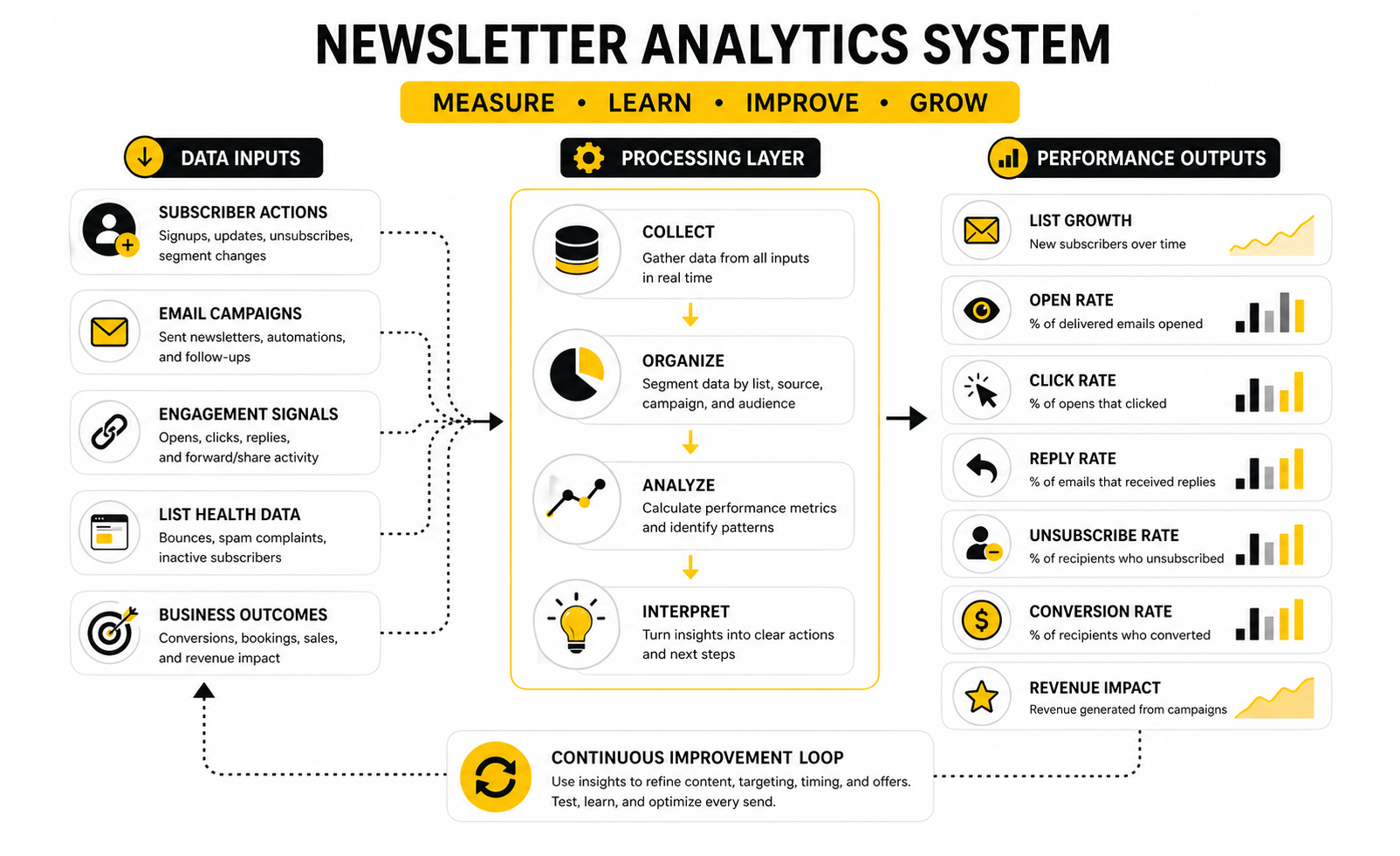 Track five numbers first: list growth, open rate, click rate, unsubscribe rate, and conversion rate. List growth tells you whether your offer is attracting people. Click rate tells you whether the email created enough intent for someone to act.
