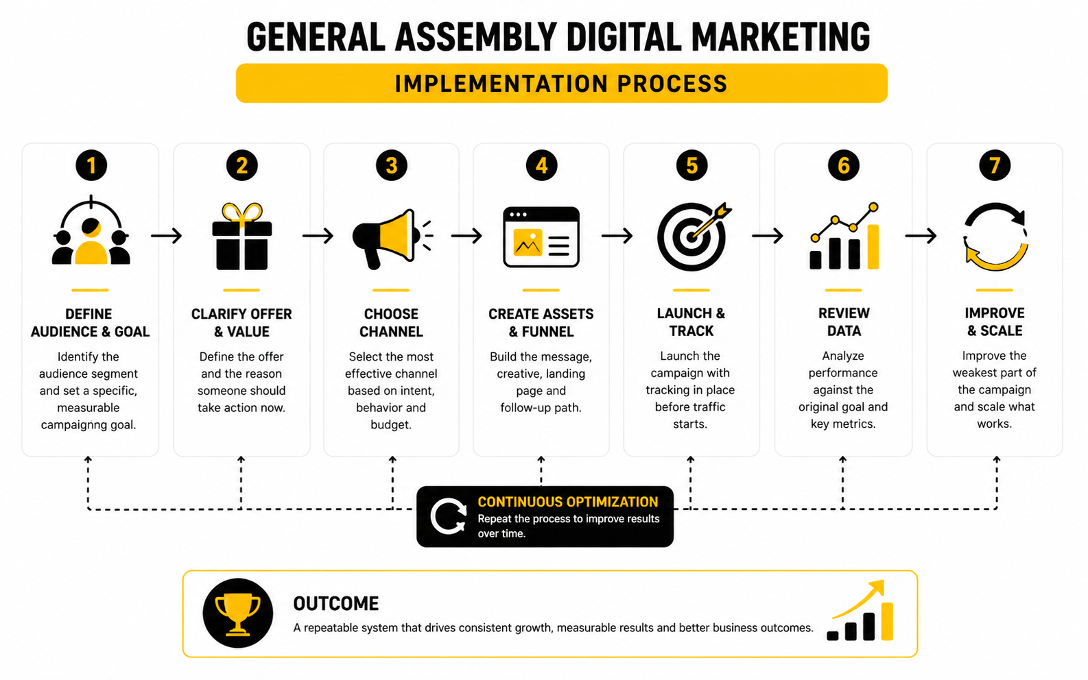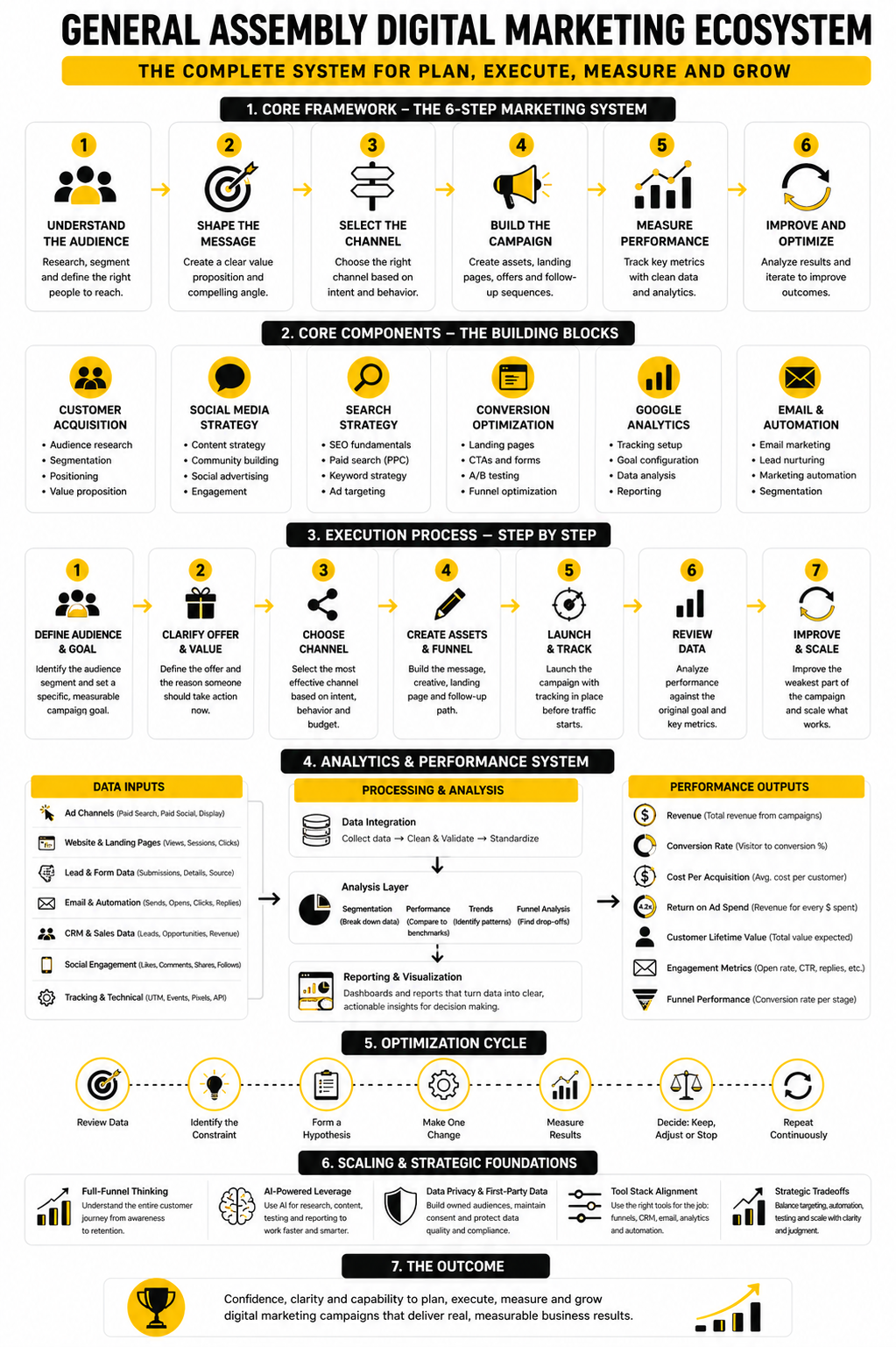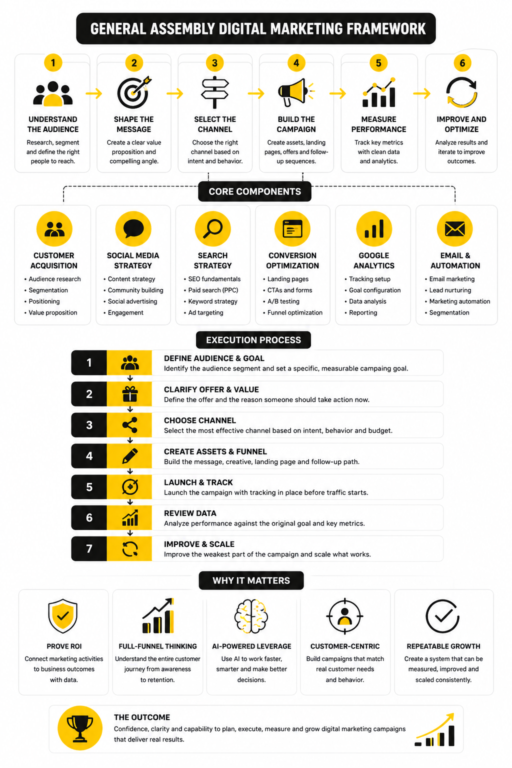 The strongest outcome from General Assembly digital marketing is not just knowing more terms. It is leaving with a practical operating system for marketing work. You should understand the customer, choose the channel, build the campaign, measure the result, and improve the system without needing every step explained again.