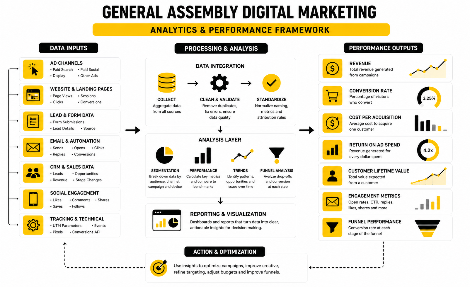 Data is where General Assembly digital marketing starts to become more than campaign theory. A marketer can have a clean strategy, strong creative, and a logical funnel, but the numbers decide what deserves more attention. The point is not to collect every metric available. The point is to know which signals show progress, which signals expose friction, and which signals are just noise.