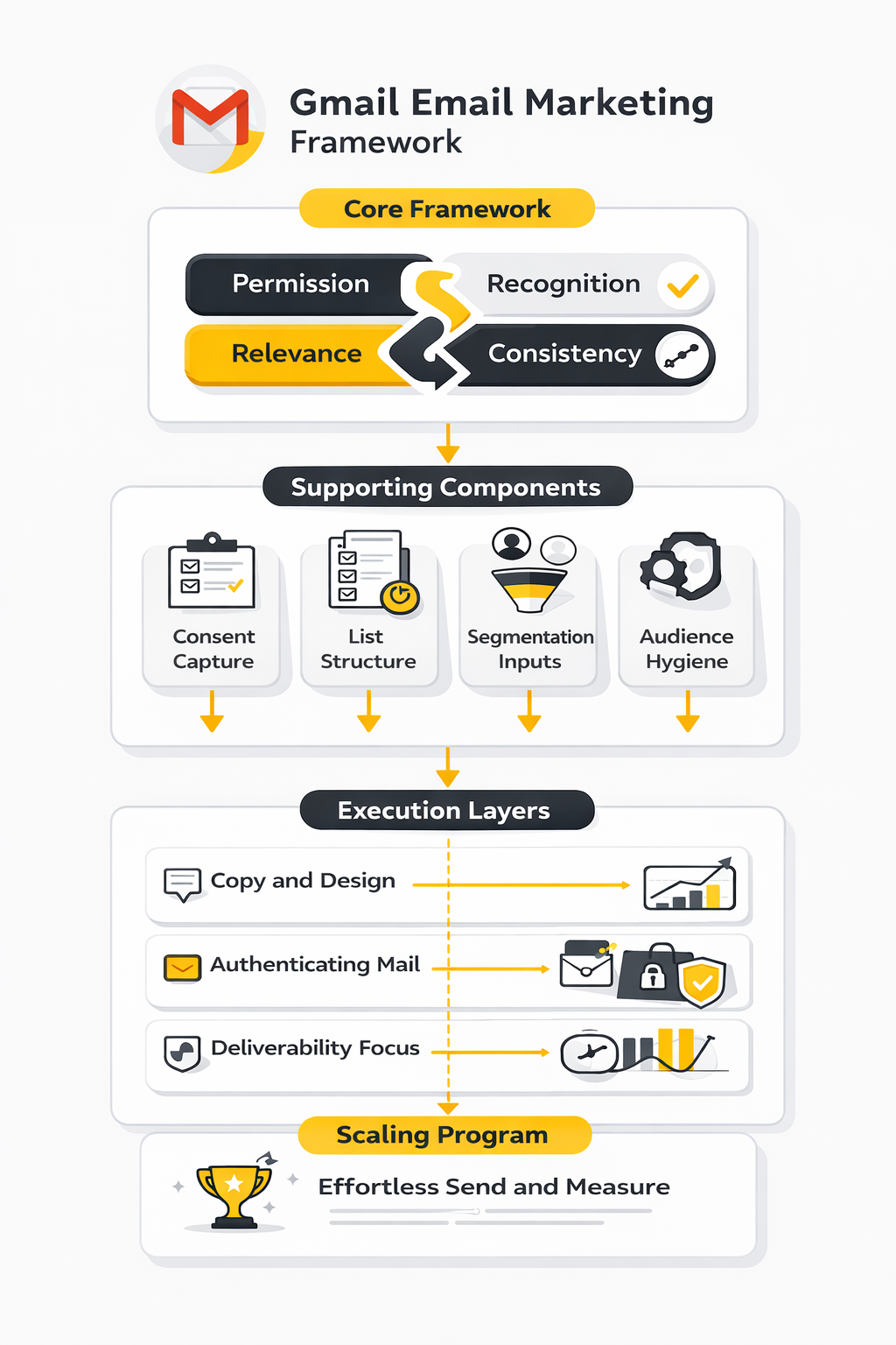 This article is built as one system, not six disconnected essays. We start with the strategic case for Gmail email marketing, then move into the framework that makes the channel work, and then into execution. By the end, you will have a practical model for building a program that is easier to send, easier to measure, and much harder for Gmail to distrust.