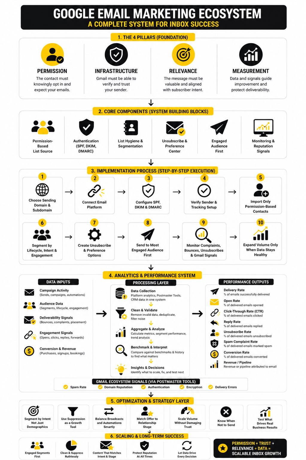 A strong Google email marketing system has four layers: permission, infrastructure, relevance, and measurement. Permission answers whether people should be receiving your emails in the first place. Infrastructure answers whether Gmail can trust your domain and technical setup.