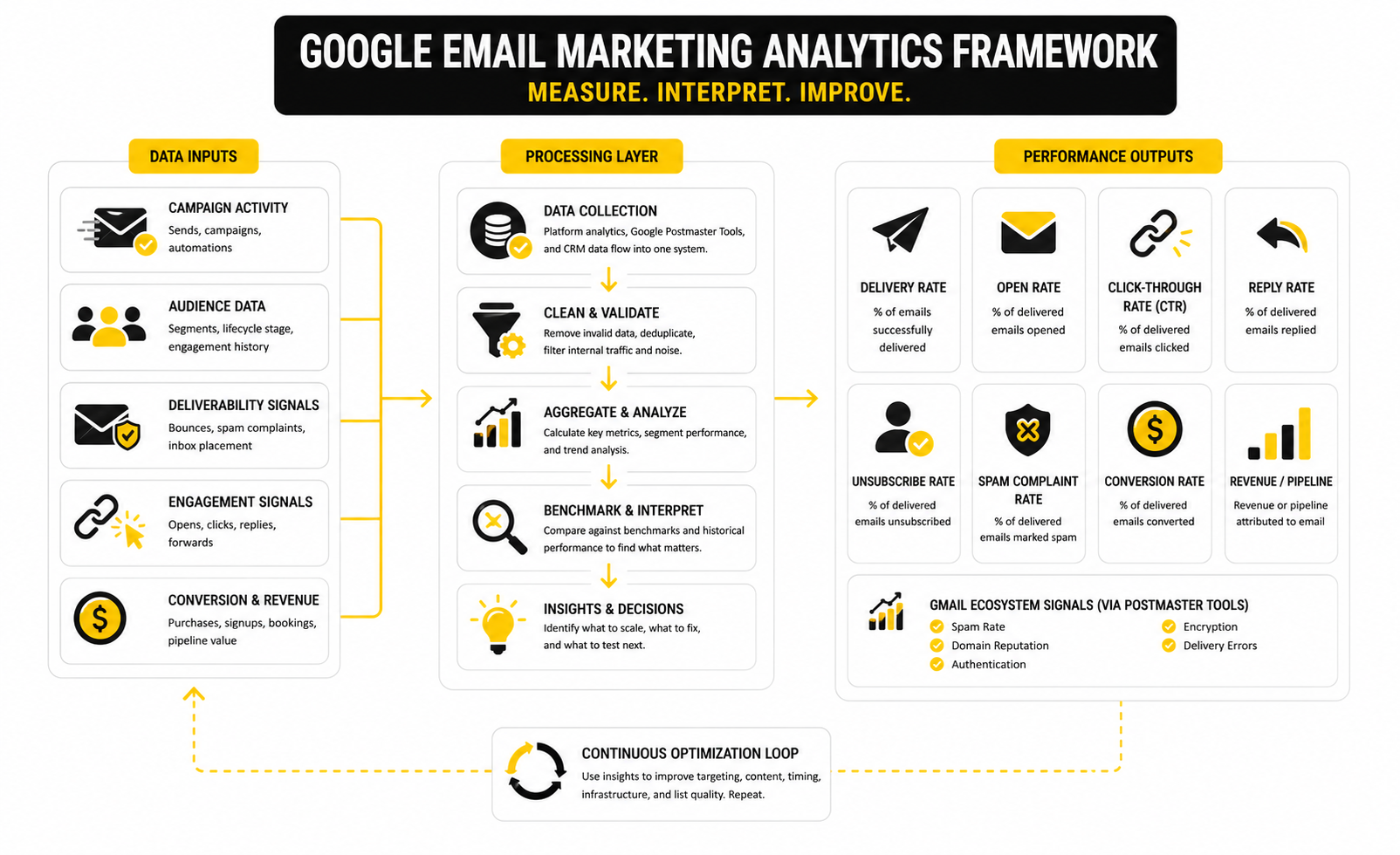 Data is useful only when it changes what you do next. In Google email marketing, the goal is not to collect every possible metric. The goal is to understand whether Gmail users are receiving, trusting, opening, clicking, ignoring, unsubscribing from, or reporting your emails.