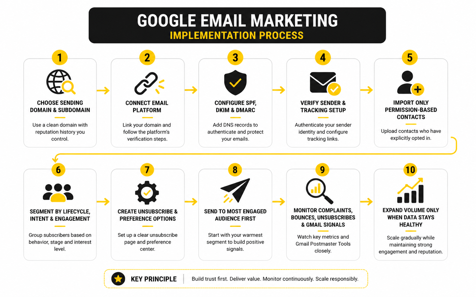 Professional implementation turns the framework into an operating process. This is where Google email marketing becomes tangible: you define the domain, authenticate the sender, organize the list, build the segments, create the unsubscribe path, send gradually, and monitor the results. None of this is flashy, but it is exactly what separates reliable email programs from fragile ones.