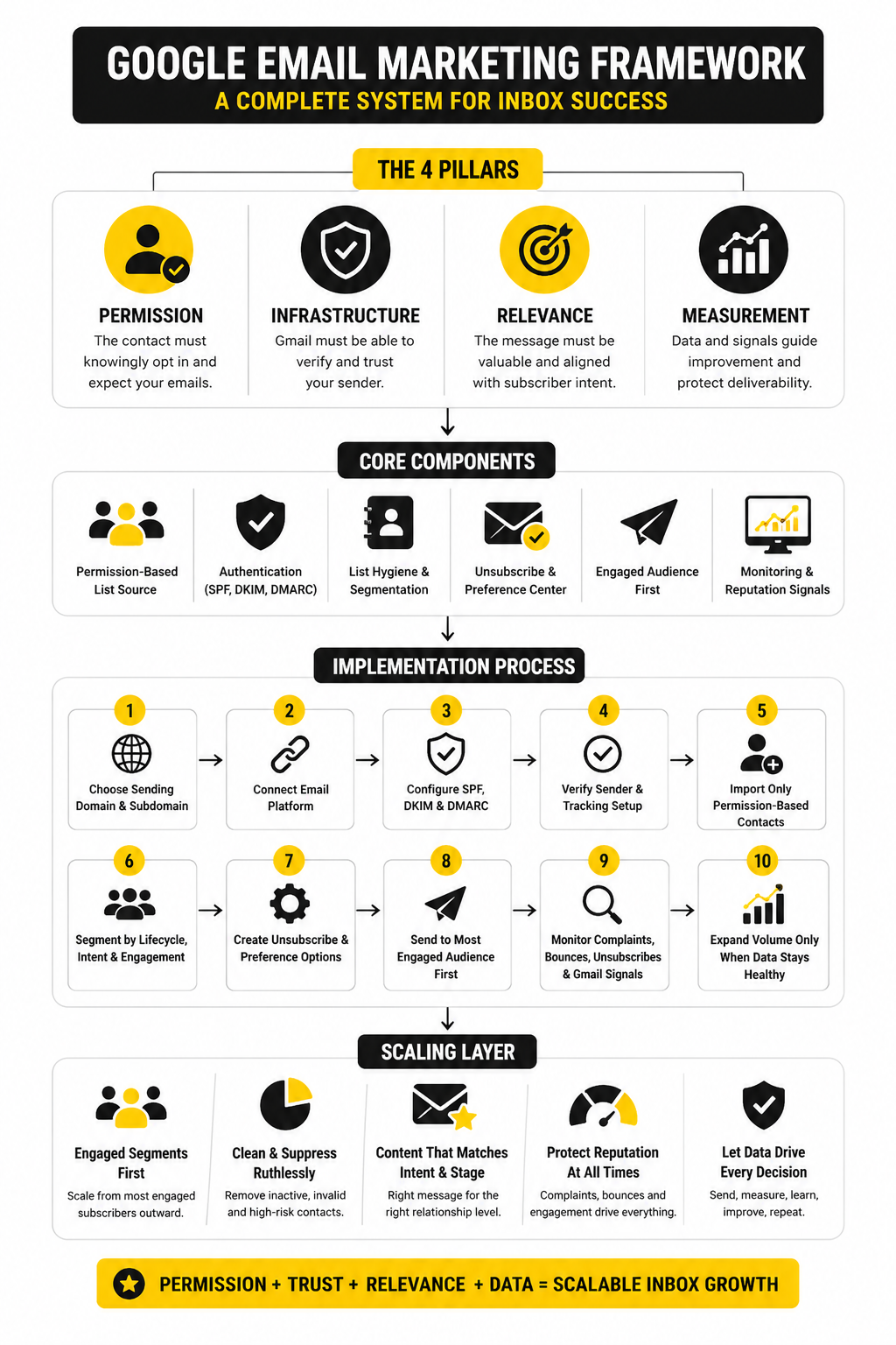 A strong Google email marketing system is not built around one campaign. It is built around a repeatable framework that protects your sender reputation while giving subscribers a clear reason to keep engaging. That framework has four practical layers: permission, infrastructure, relevance, and measurement.