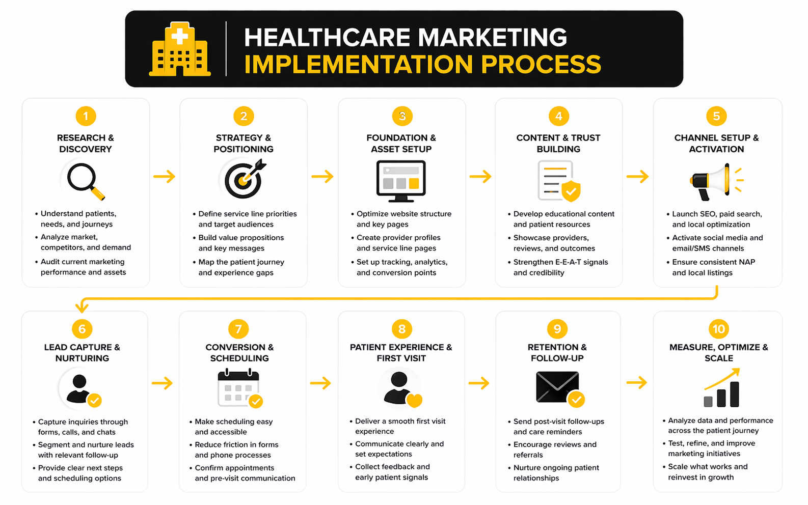 This is the point where healthcare marketing becomes tangible. If a team wants to improve growth without creating more chaos, the execution process needs to be simple enough to follow and strict enough to enforce.