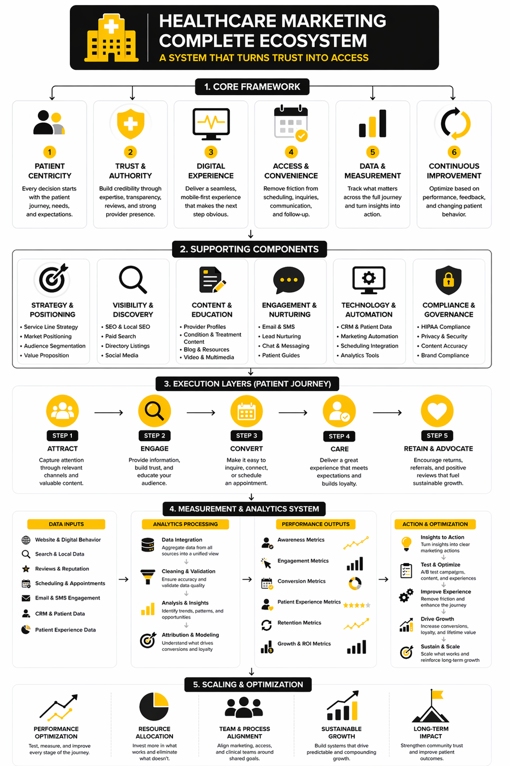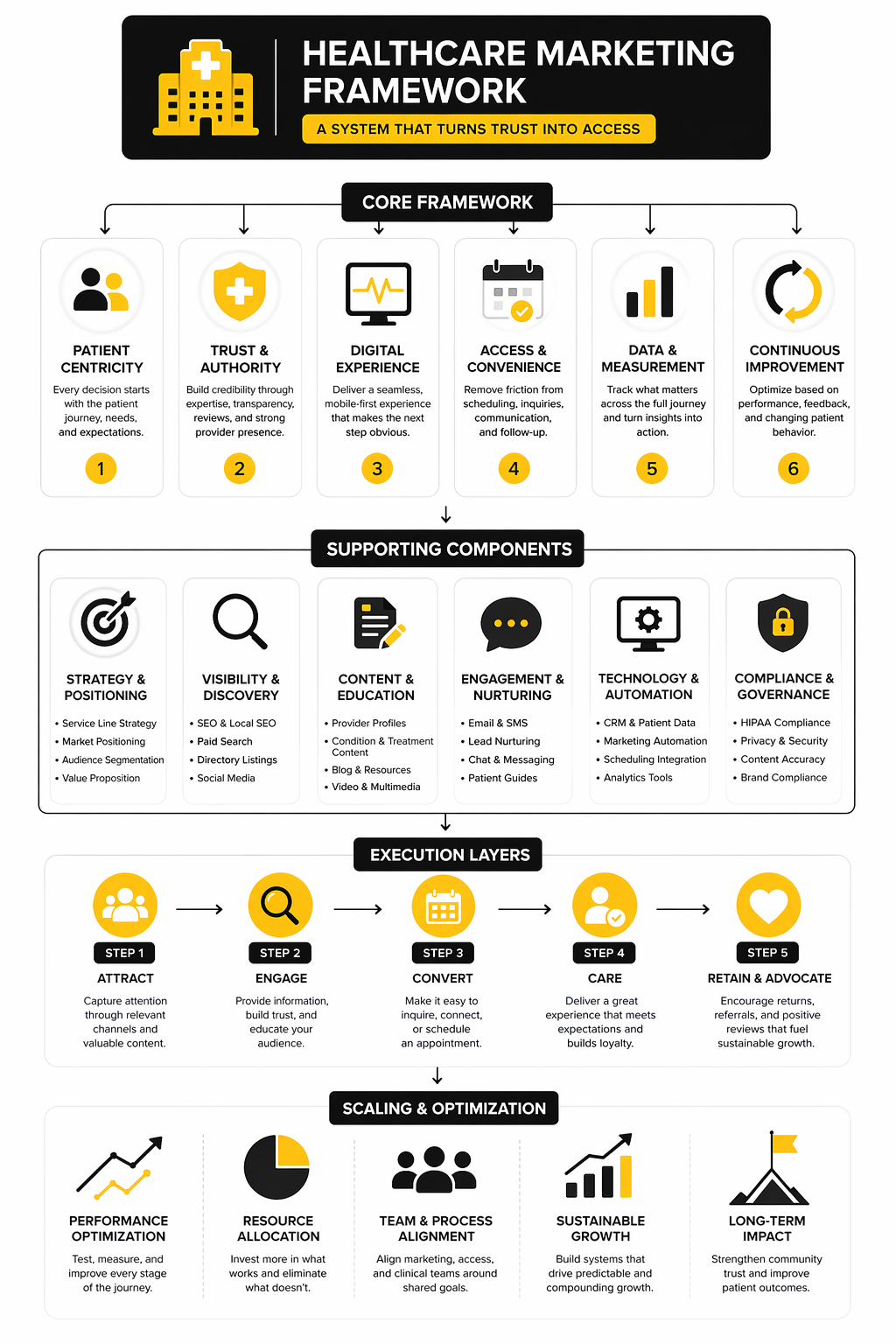 A practical way to think about healthcare marketing is to stop viewing it as promotion and start viewing it as a system. The strongest teams operate across four connected layers: market understanding, trust creation, access design, and performance improvement. That is the framework the rest of this article will use, because it reflects how modern healthcare decisions are really made.