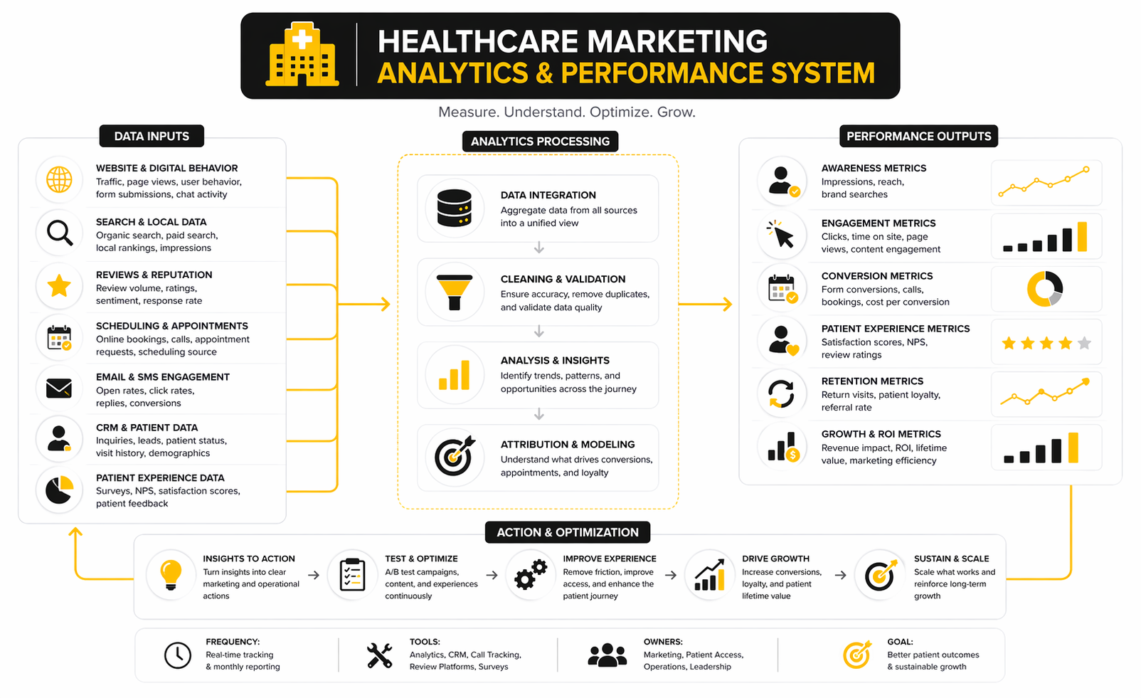 The fourth layer is performance improvement. Healthcare marketing should be measured by business outcomes and patient-centered outcomes together, not by vanity metrics in isolation. That means connecting channel performance to appointment conversion, leakage reduction, service-line growth, provider utilization, review velocity, patient acquisition cost, and experience signals that show whether growth is actually sustainable.