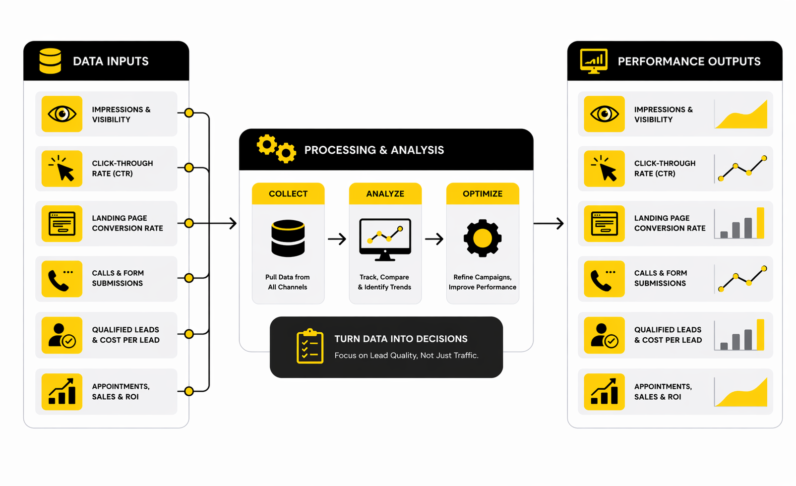 The problem is not data scarcity. It is data interpretation. Most agencies can show clicks, impressions, and traffic growth, but those are only useful when they connect to qualified leads, appointments, close rates, and customer acquisition cost. Without that chain, the numbers can look busy while the business stays stuck.