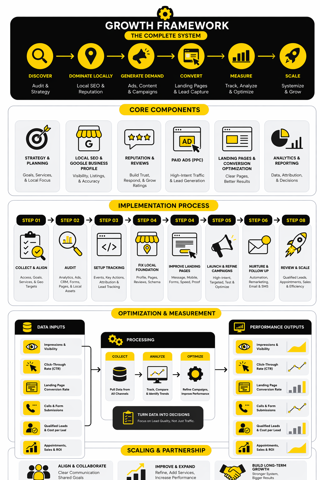- Audit analytics, ad accounts, CRM, forms, landing pages, and local search assets.