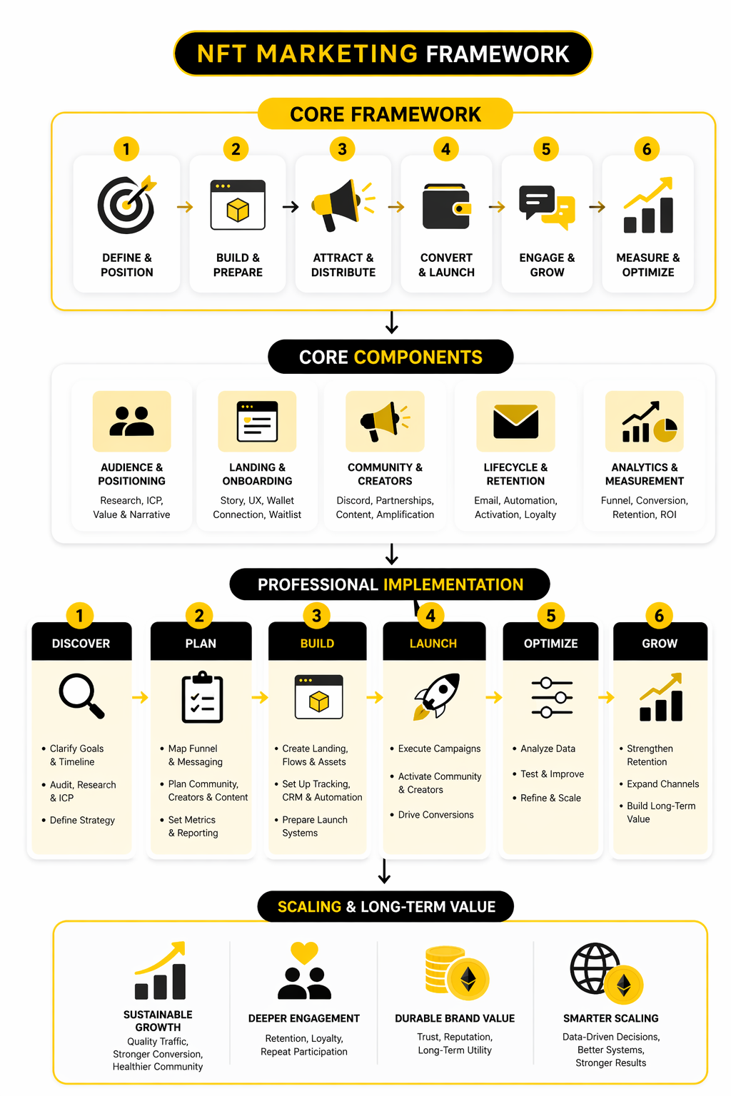 The simplest way to evaluate an nft marketing agency is to stop asking whether it can “promote the drop” and start asking whether it can build a full growth system. The right framework has four moving parts: positioning, distribution, conversion, and retention. If one of those breaks, the campaign might still look active on the surface, but it will not compound.