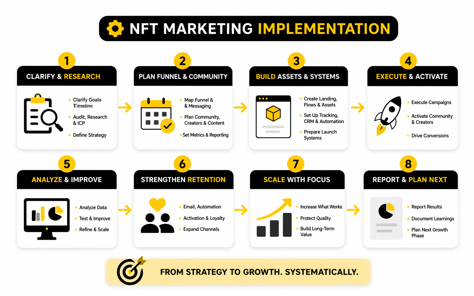 A real nft marketing agency does much more than promote a mint. It helps define the offer, sharpen the positioning, build the landing and onboarding flow, coordinate creators, manage community systems, set up retention, and measure what is working. The point is not just to get attention, but to turn attention into trust, conversion, and continued participation.