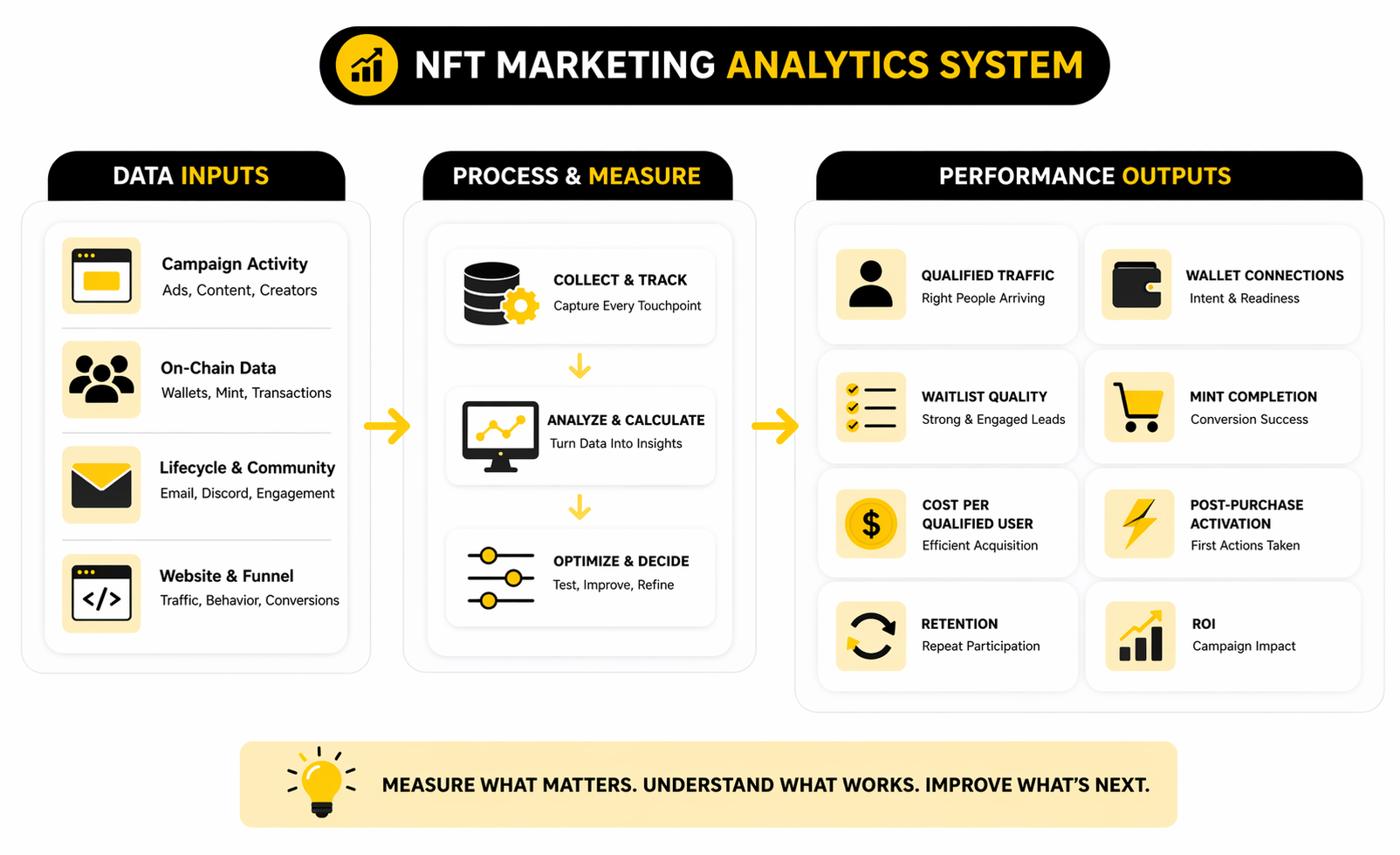 The last core service is measurement, and most weak agencies undersell it because it exposes whether the campaign is actually working. Vanity dashboards are easy. Useful reporting is harder, because an NFT project needs to track qualified traffic, allowlist conversion, mint completion, wallet connects, community activation, creator-assisted conversions, retention behavior, and secondary-market signals without pretending they all mean the same thing.