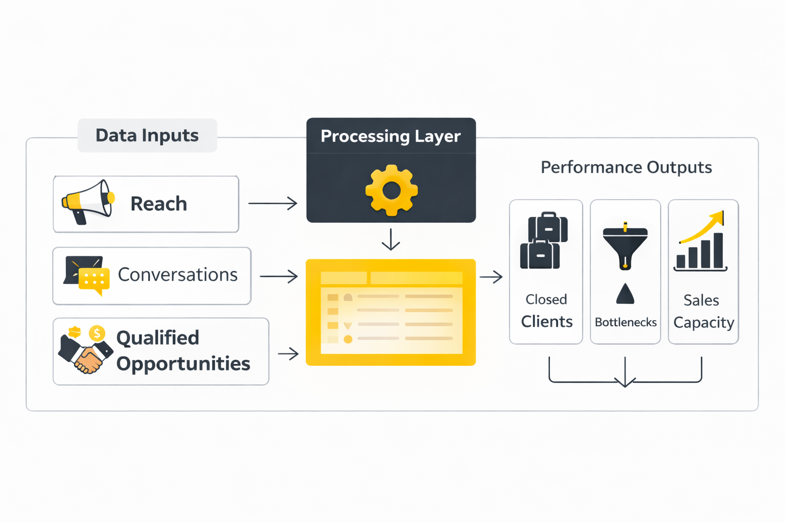 Each stage filters the previous one. Large reach is useless if it does not produce conversations, and conversations are meaningless if they never turn into real opportunities.