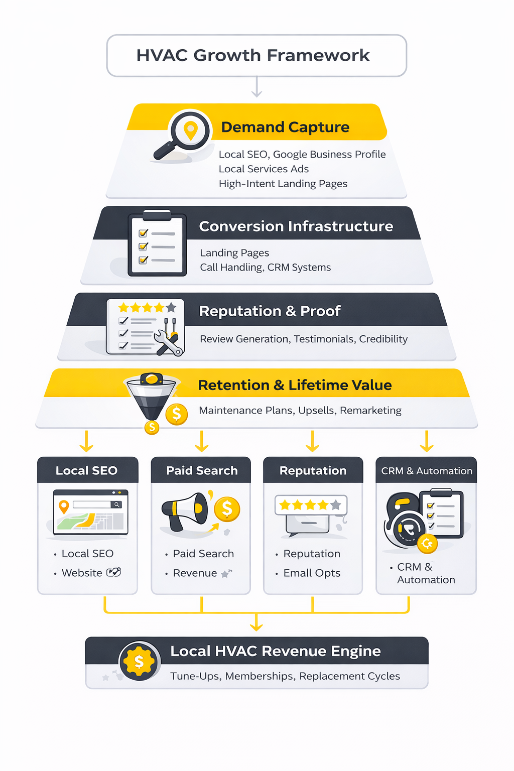 The simplest way to evaluate an HVAC marketing agency is this: can it build a system instead of a pile of tactics? Good HVAC marketing is not “SEO over here, Google Ads over there, maybe some Facebook posts if there is time.” It is a connected framework that captures existing demand, creates future demand, converts attention into leads, and then turns one-time customers into repeat revenue through maintenance, membership, and replacement cycles.