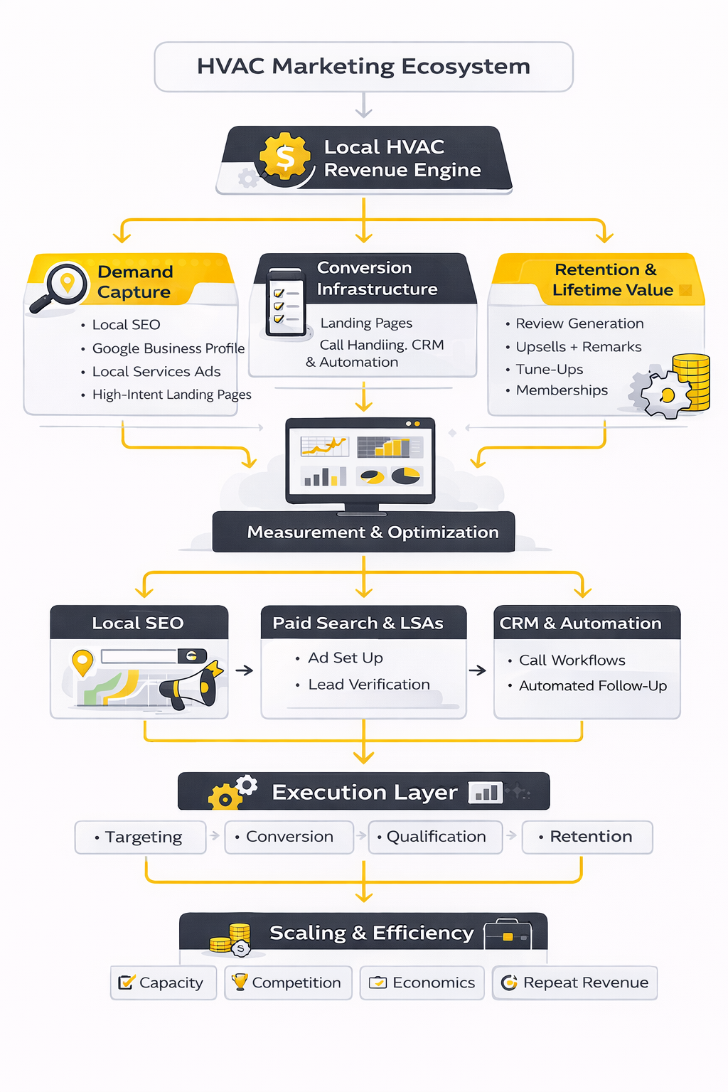 The fix is not more complexity. It is better discipline. A strong HVAC marketing agency keeps the full system visible: local presence, paid demand capture, review quality, response speed, booking performance, customer retention, and the economics that connect all of it.