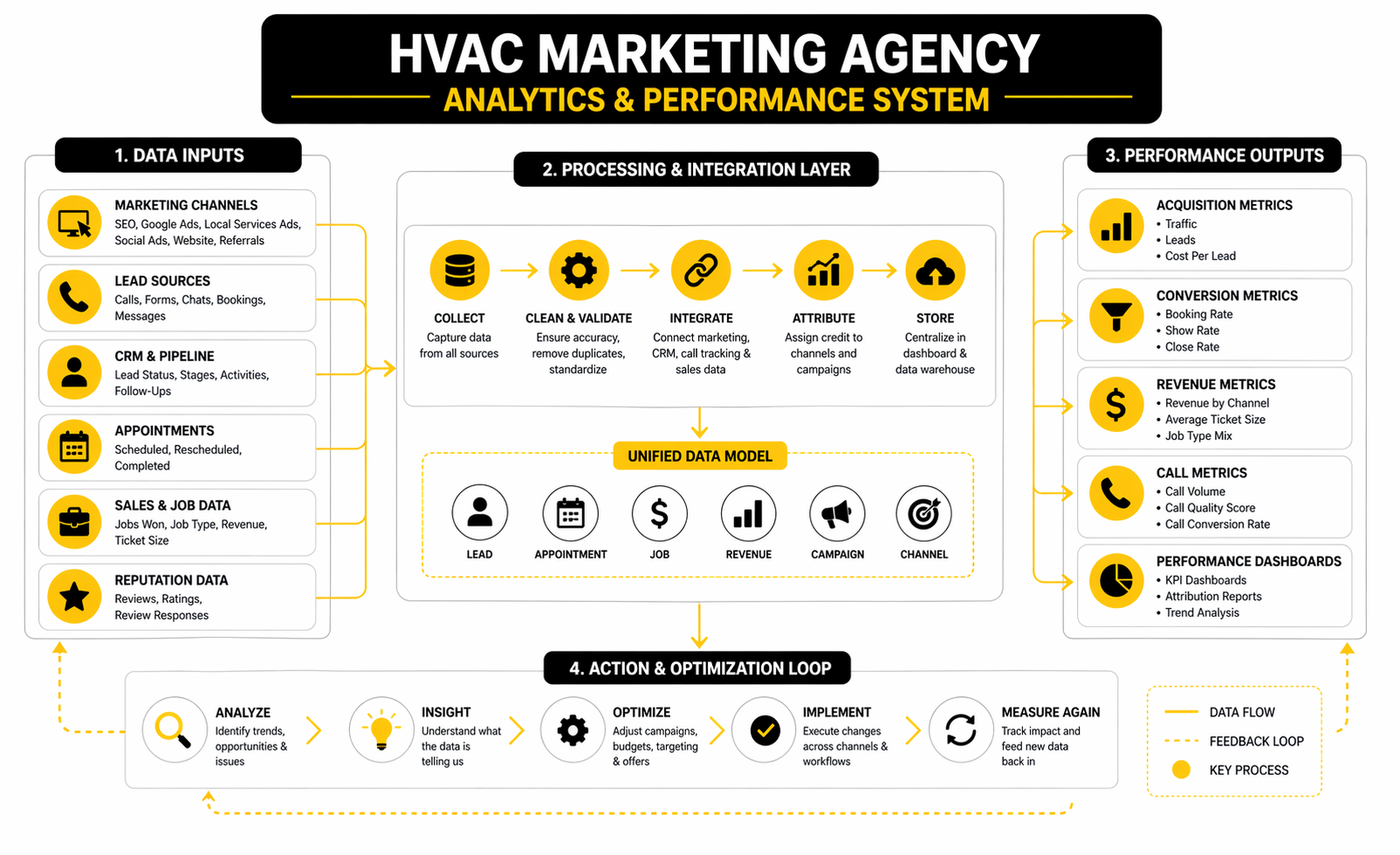 The system should be simple enough to run every week without drama. At a minimum, an HVAC marketing agency should be able to connect traffic source, call tracking, form submissions, booking status, pipeline stage, and revenue outcome in one consistent reporting process. The technology can vary, but the logic cannot.
