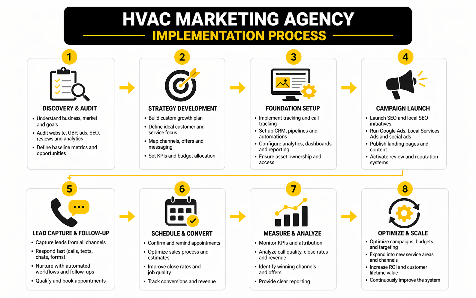 This is where the process needs to get tangible. Not theoretical, not “best practices” slides, but an operating sequence the contractor can actually inspect. A real HVAC marketing agency should be able to walk through implementation in a way that feels operational from the first week, because paid acquisition breaks fast when ownership gets fuzzy.