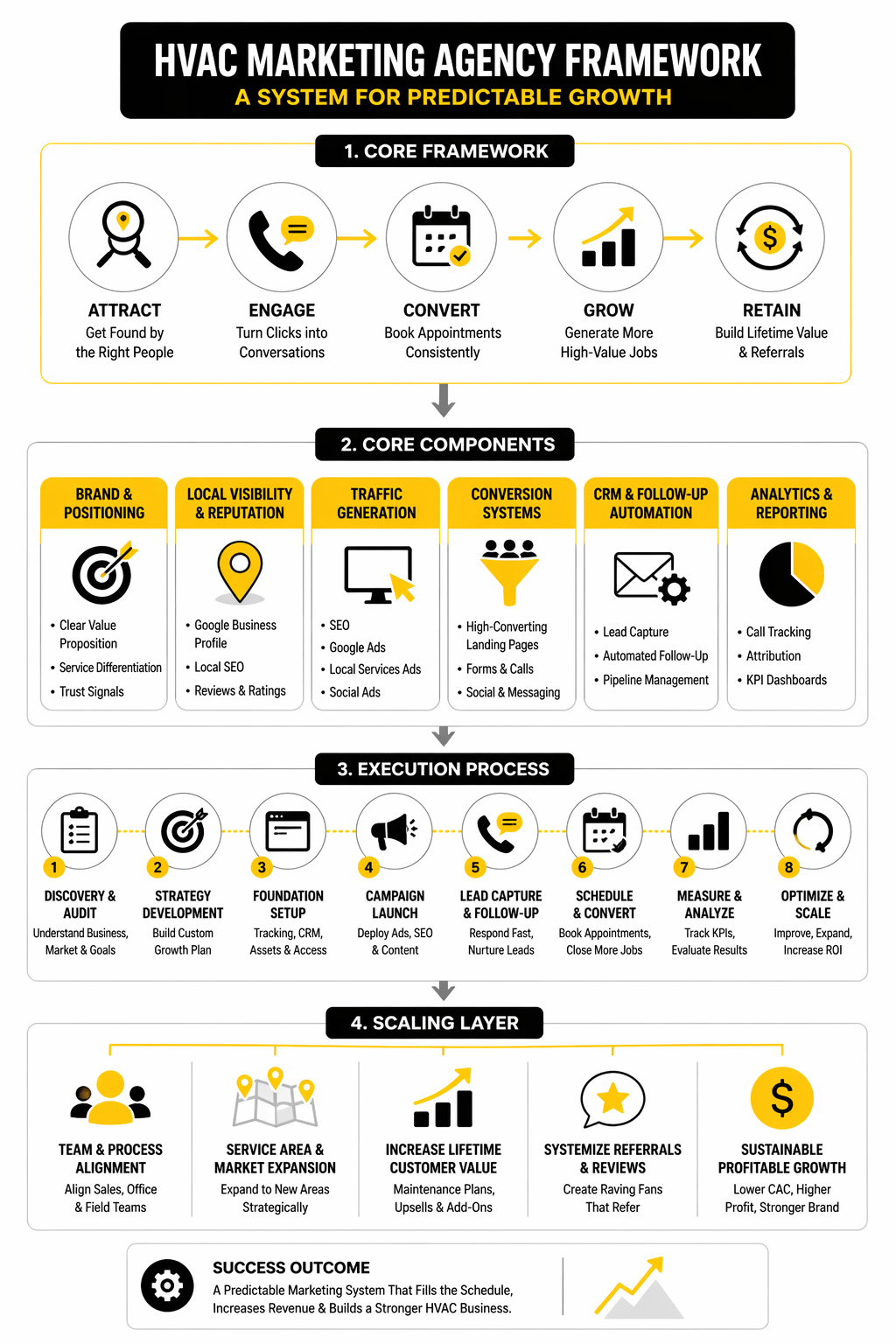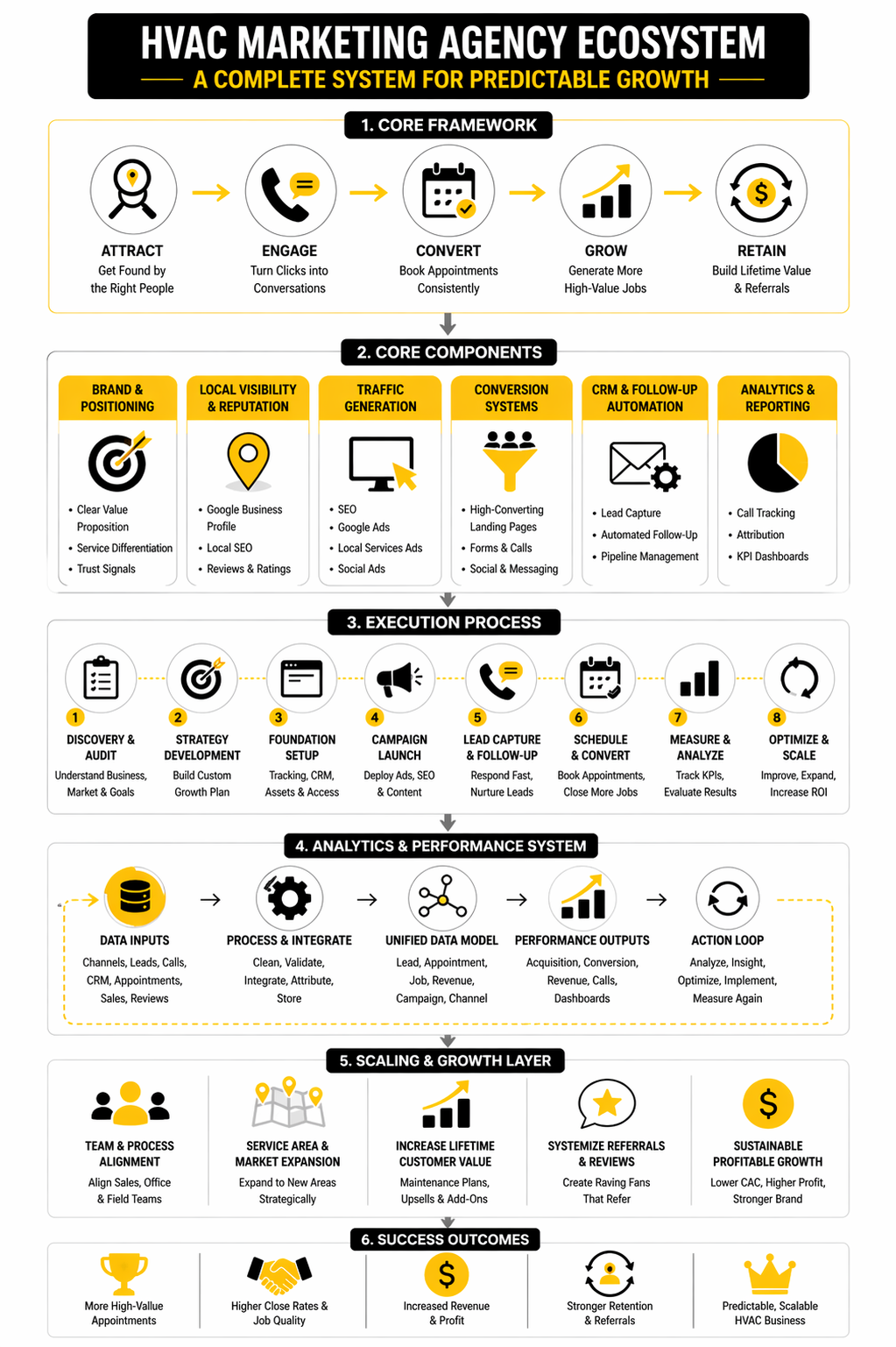 A real HVAC marketing agency should show how local visibility, paid traffic, intake, automations, and pipeline reporting reinforce each other. If those pieces are disconnected, the business pays for complexity without getting the benefit of an actual system.