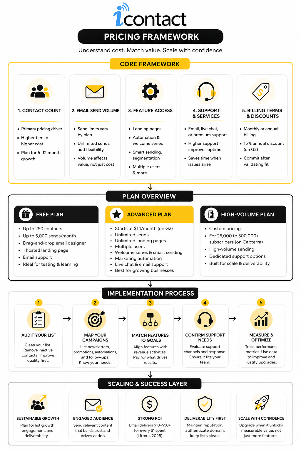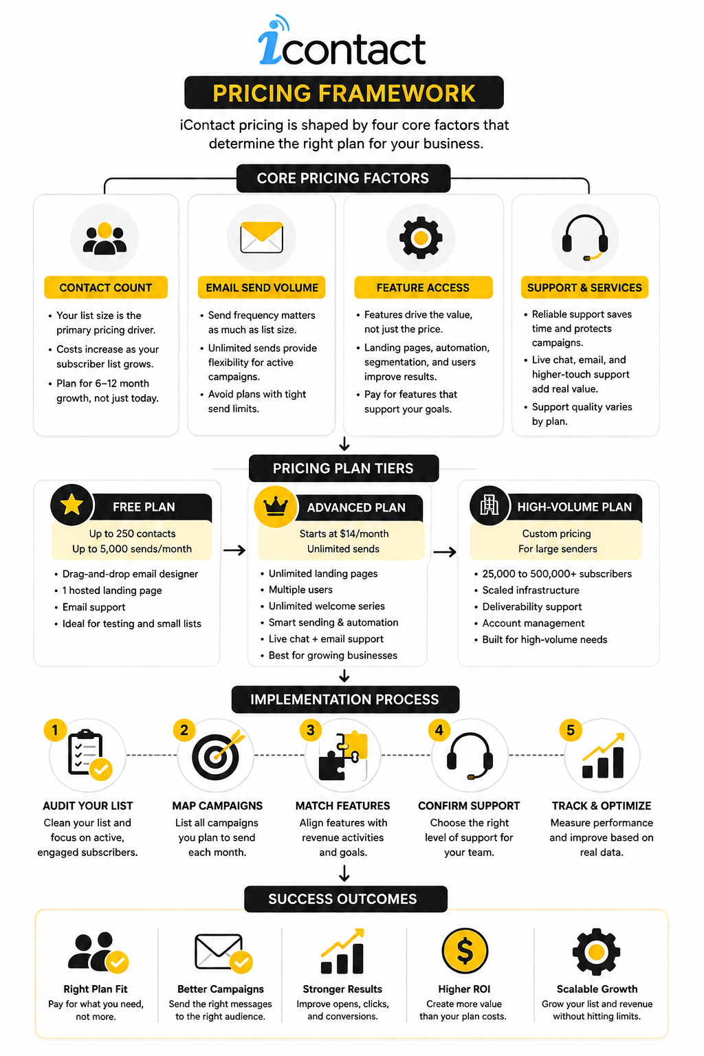 That is the right way to judge iContact pricing. Do not pay for complexity just because it sounds powerful. Pay for the features that directly support list growth, conversion, retention, or operational speed.