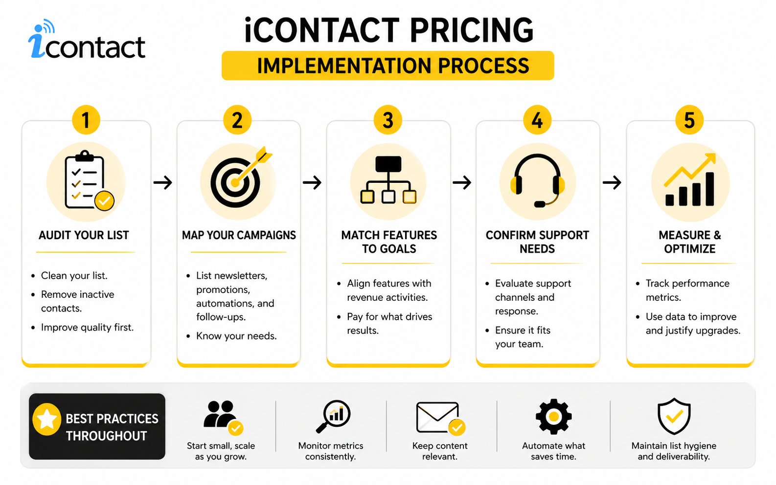 A simple implementation process keeps the decision grounded. Start with your current list, your planned campaigns, your required features, and your support needs. Then compare that against the plan limits and upgrade triggers.