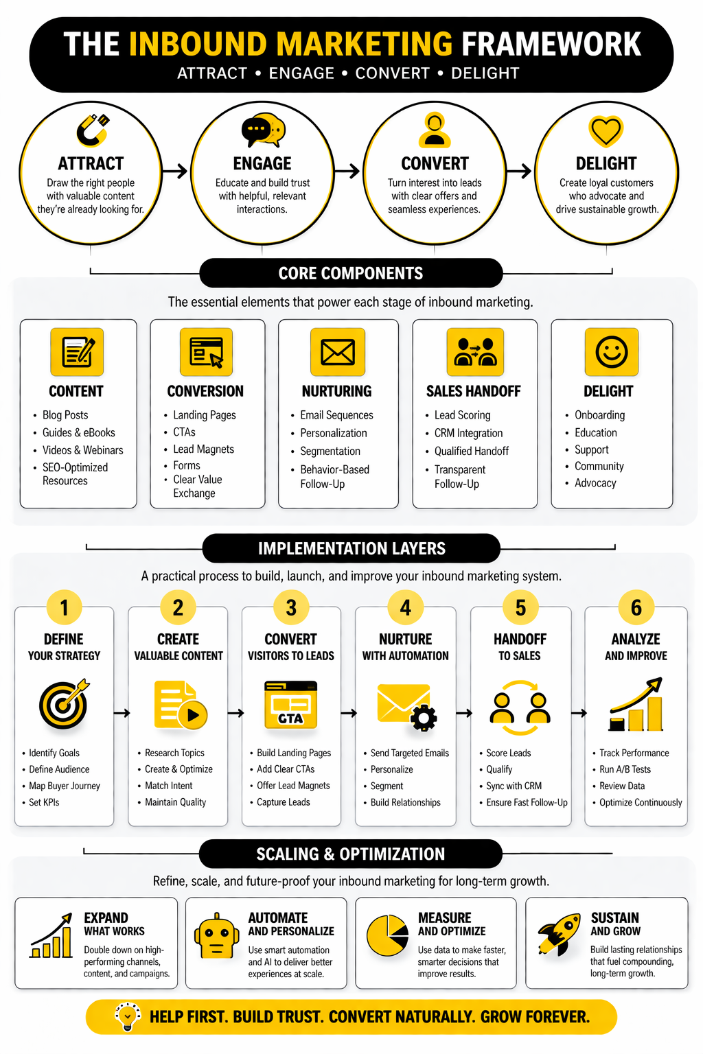 At its core, inbound marketing moves people through four practical stages: attract, convert, nurture, and advance. First you earn attention with content, search visibility, social distribution, and useful entry points. Then you capture intent with pages, forms, lead magnets, demos, bookings, or conversations that give the visitor a clear next action.
