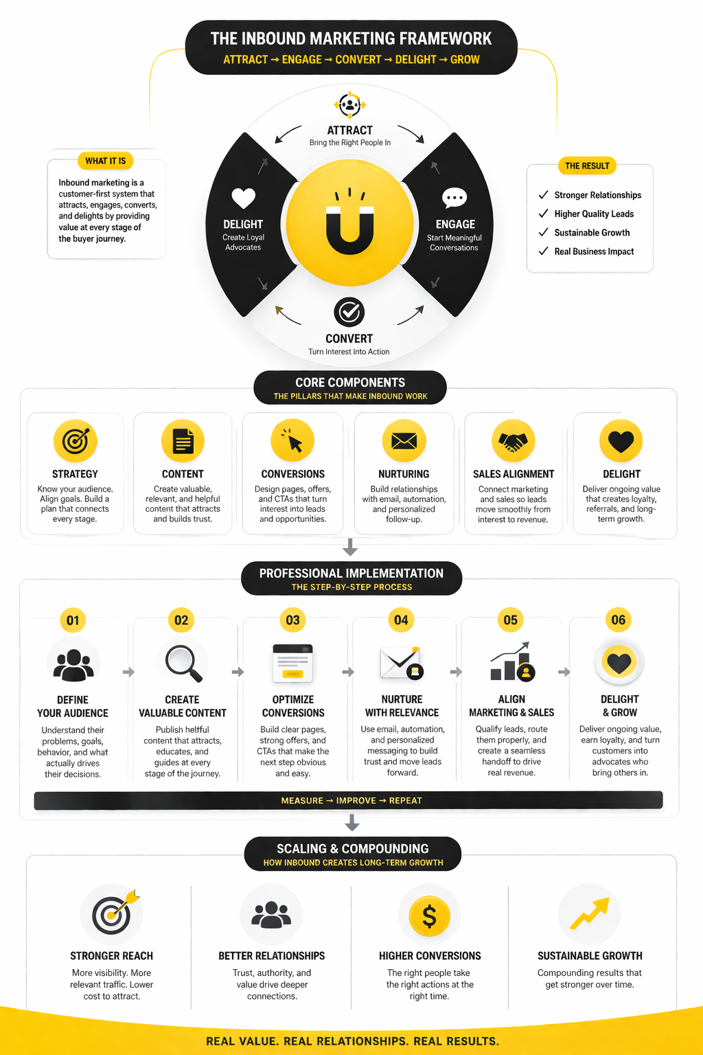 Inbound marketing only works when the system is built from components that support each other. A blog alone is not inbound. A lead magnet alone is not inbound. A newsletter alone is not inbound. What actually produces results is the combination of audience insight, discoverable content, conversion paths, nurturing, and operational follow-through.