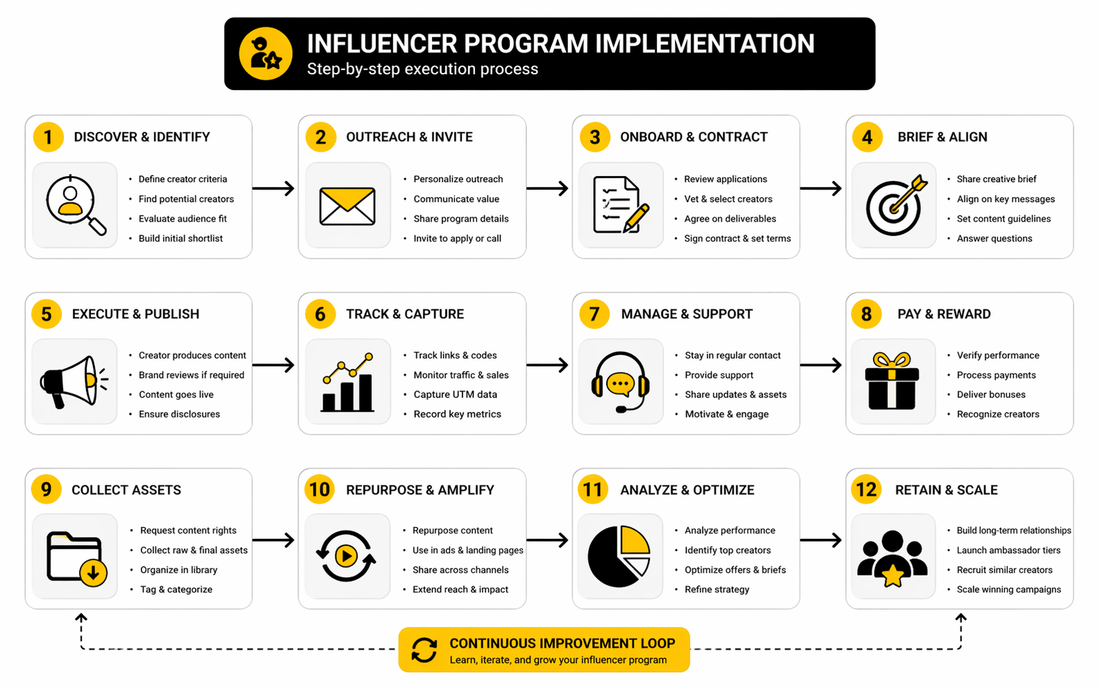 The easiest way to keep execution tight is to reduce it to a sequence the whole team understands. That sequence does not need to be complicated. It needs to be consistent. Once the same steps repeat often enough, the influencer program becomes faster without becoming sloppy.