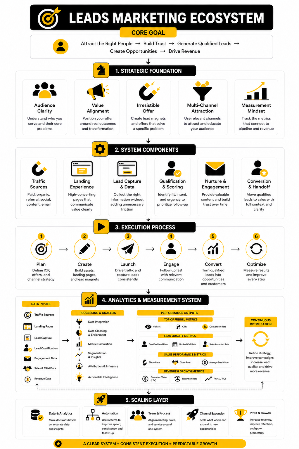 The final layer is the ecosystem view. Leads marketing works best when every part of the system supports the same commercial goal. Traffic creates attention, offers turn attention into permission, qualification protects the pipeline, follow-up builds trust, and measurement shows what deserves more investment.