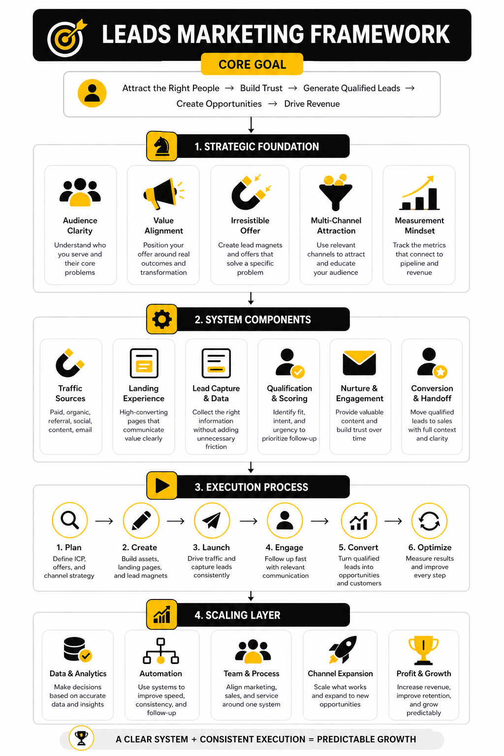 A strong leads marketing framework has four layers: attraction, capture, qualification, and conversion. Attraction brings the right people into the system. Capture gives them a clear reason to identify themselves. Qualification separates curiosity from serious intent. Conversion moves the right lead toward a call, demo, checkout, quote, or sales conversation.