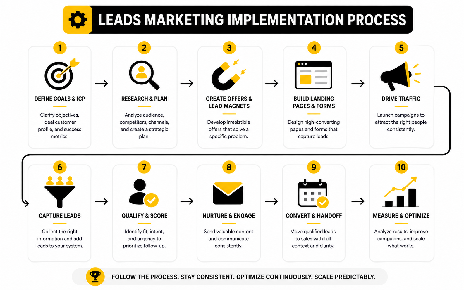 Leads marketing is the process of attracting, capturing, qualifying, nurturing, and converting people who show interest in your offer. It connects marketing activity to a measurable pipeline instead of treating traffic or awareness as the final goal. The best systems focus on lead quality, not just lead volume.