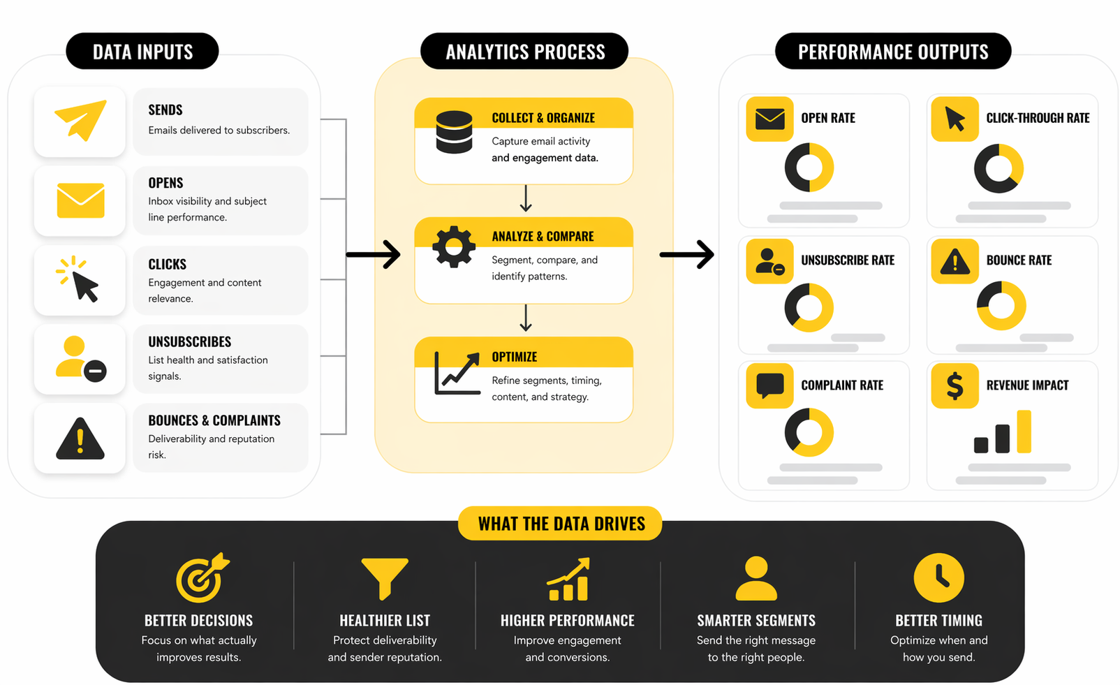 The action here is simple but important. Rising unsubscribes should trigger a review of send frequency, segmentation precision, and promise-to-content alignment. Rising bounces should trigger list cleaning, source audits, and tighter controls on how contacts enter the database in the first place.