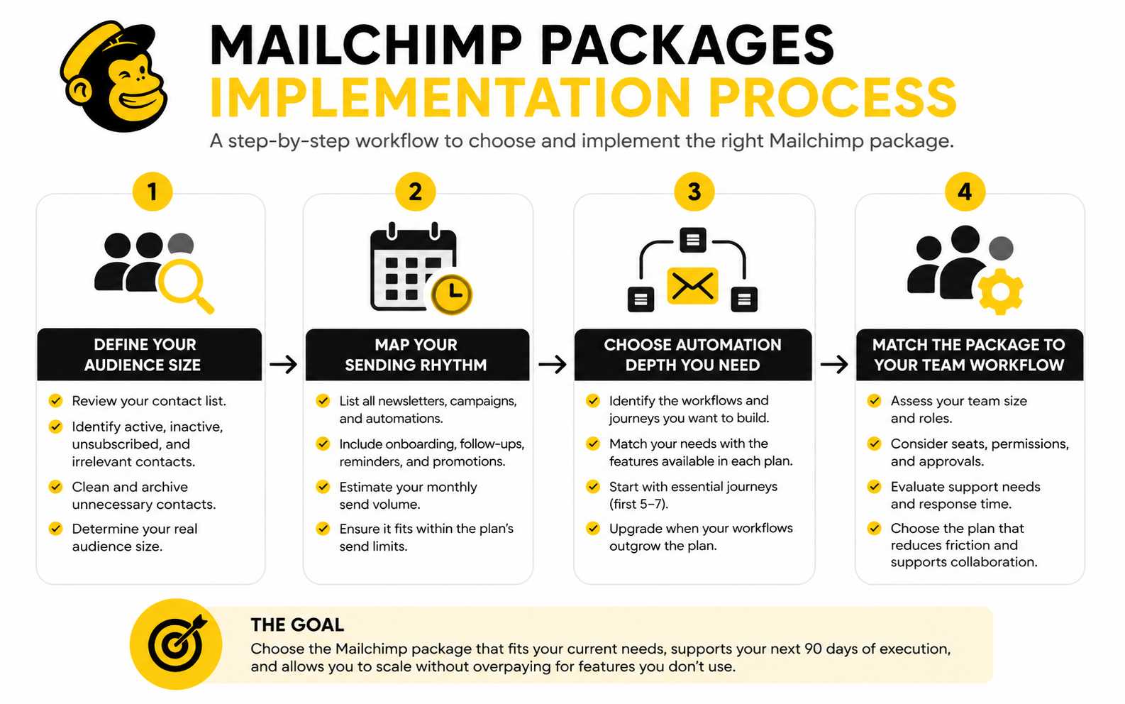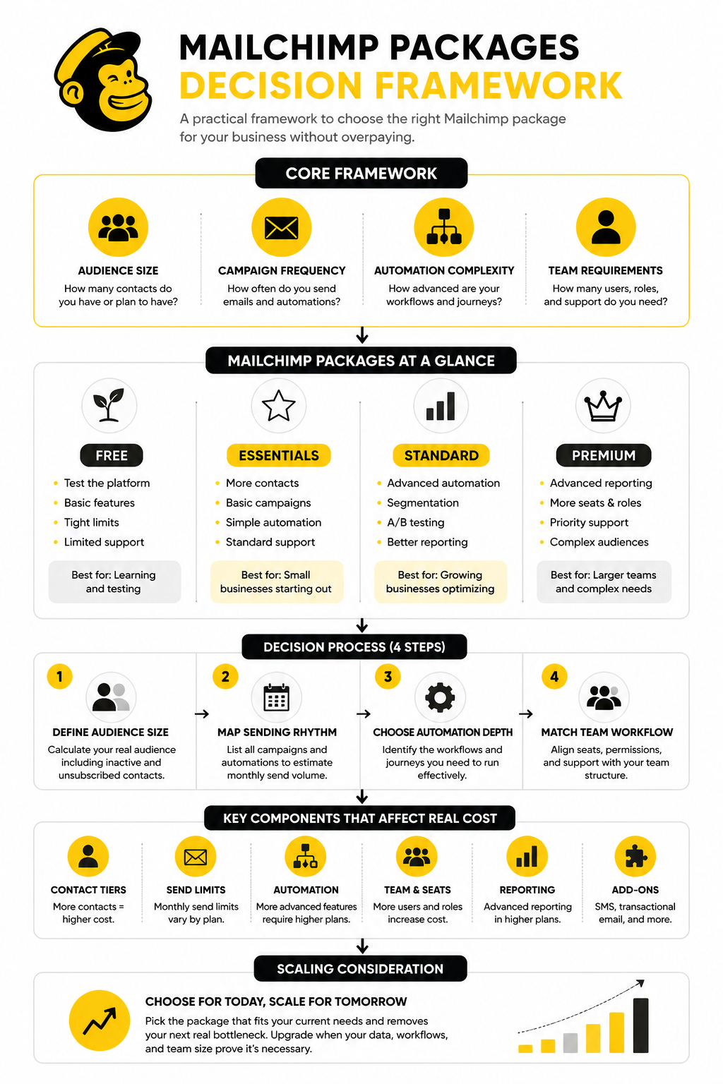 Choosing between Mailchimp packages gets much easier when you stop comparing every feature side by side and start with the way your business actually sends email. A small newsletter, a service business, an ecommerce store, and an agency all need different levels of control. The right package is the one that supports your next 90 days of execution without forcing you into unnecessary complexity.