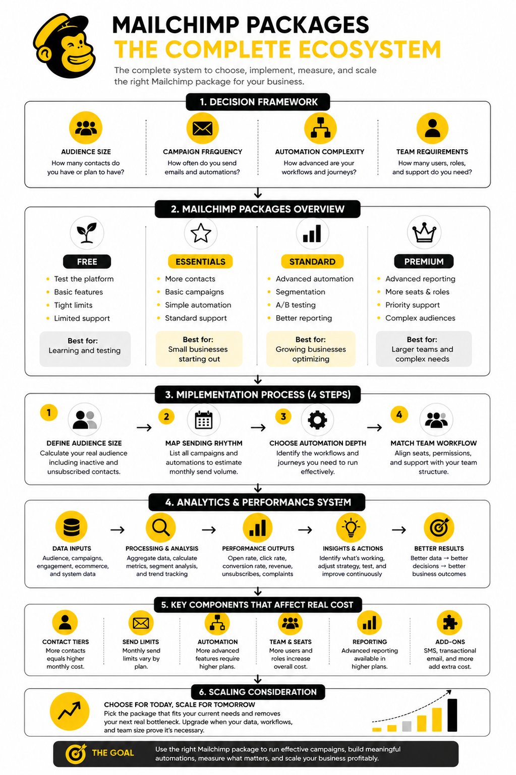 Mailchimp packages look simple at first: Free, Essentials, Standard, and Premium. But the real decision is not just which plan has the lowest monthly price. It is whether the package matches your contact list, sending volume, automation needs, reporting depth, and team workflow.