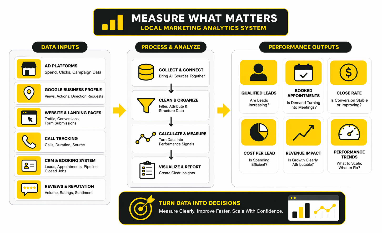 That distinction is important because local marketing data can look healthy while the business still feels stuck. Traffic can rise while lead quality drops. Calls can increase while close rates fall. Reviews can improve while search visibility stays flat. Good measurement is not about collecting more numbers. It is about understanding which numbers explain movement and which ones are just noise.