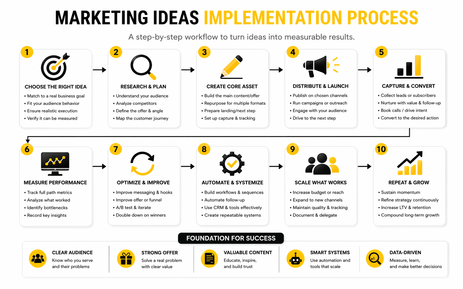 The biggest mistake is treating ideas as isolated tactics. A post, ad, email, funnel, webinar, or referral program works better when it fits the wider customer journey. Marketing becomes stronger when every idea has a clear job and a measurable next step.