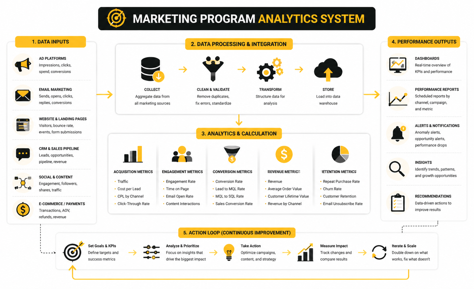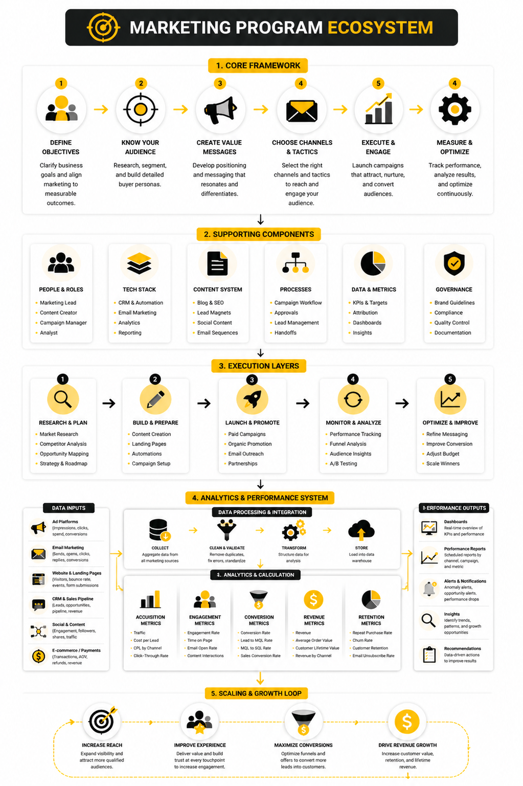 To fully understand a marketing program, it’s essential to see how every component interacts—from strategy to execution, analytics, and scaling. A cohesive ecosystem ensures each element supports the others, creating a cycle of continuous improvement and measurable results.