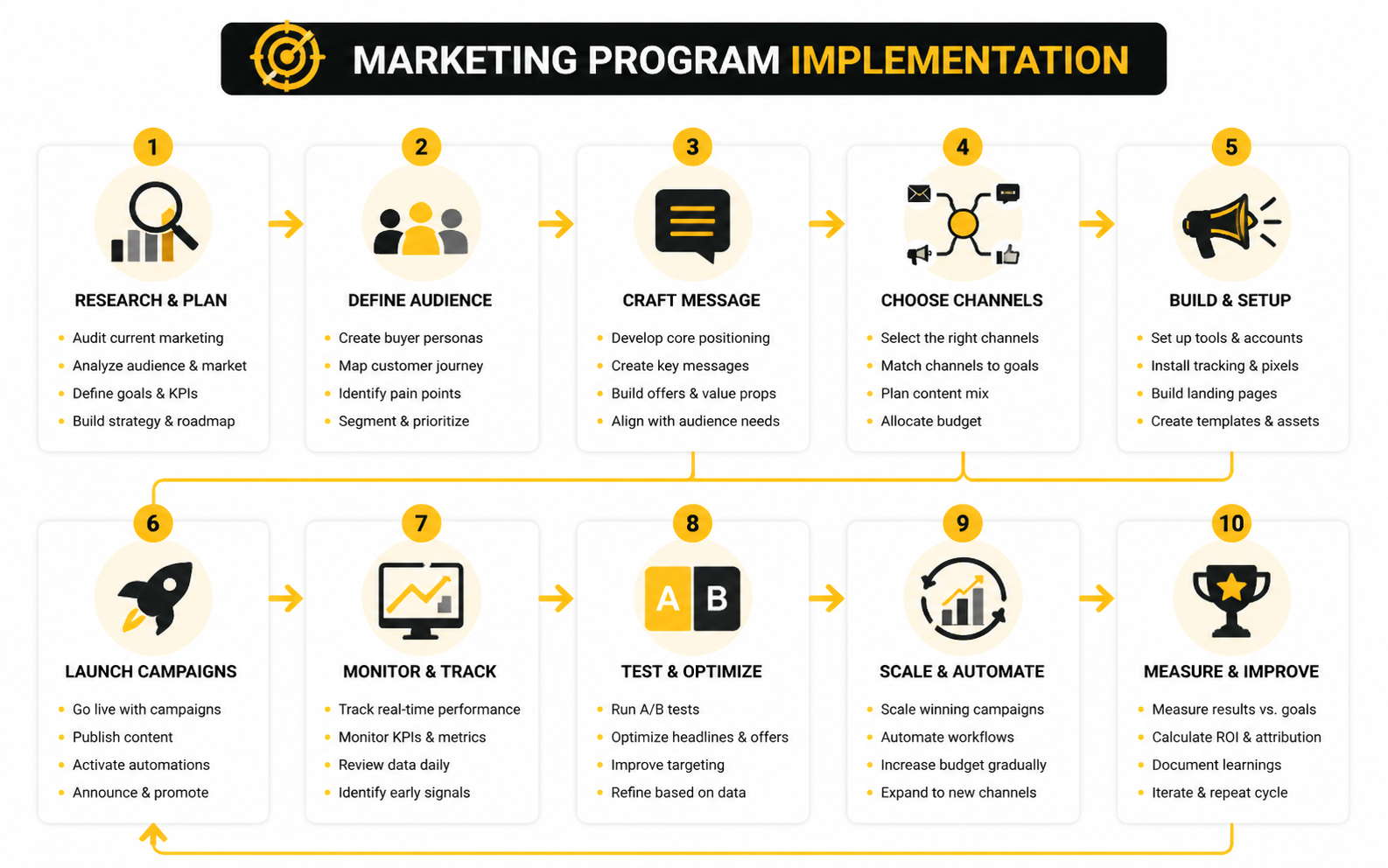Each of these steps connects the planning framework to actionable execution, creating a fully operational marketing program capable of delivering measurable business results.