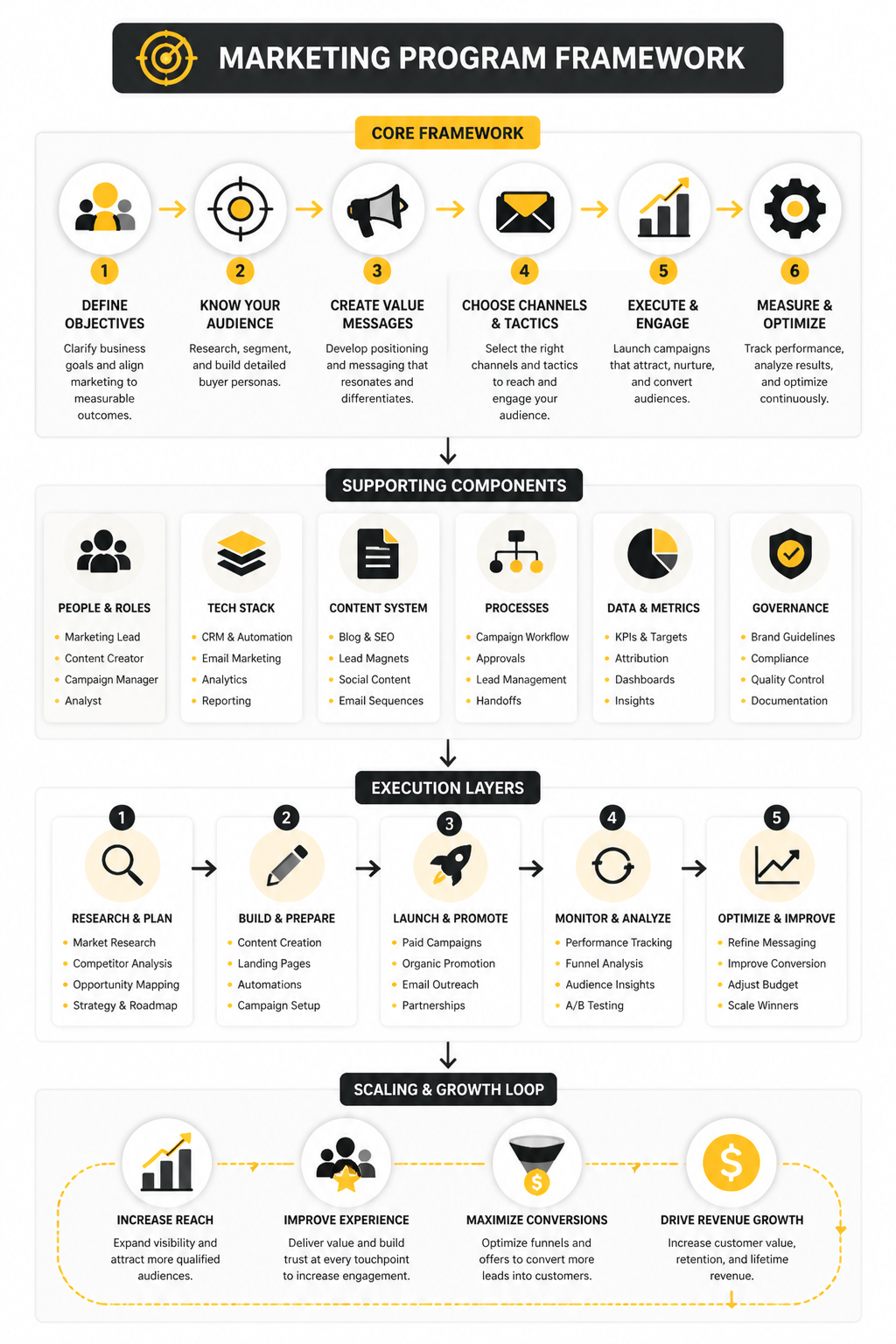 The marketing program framework is organized in hierarchical layers. At the top sits the strategic layer, defining overall objectives, target audiences, and brand positioning. Below that, supporting components manage channel selection, content planning, and audience segmentation. Execution layers implement the campaigns, while the bottom layer focuses on scalability, enabling the program to grow efficiently while maintaining cohesion.
