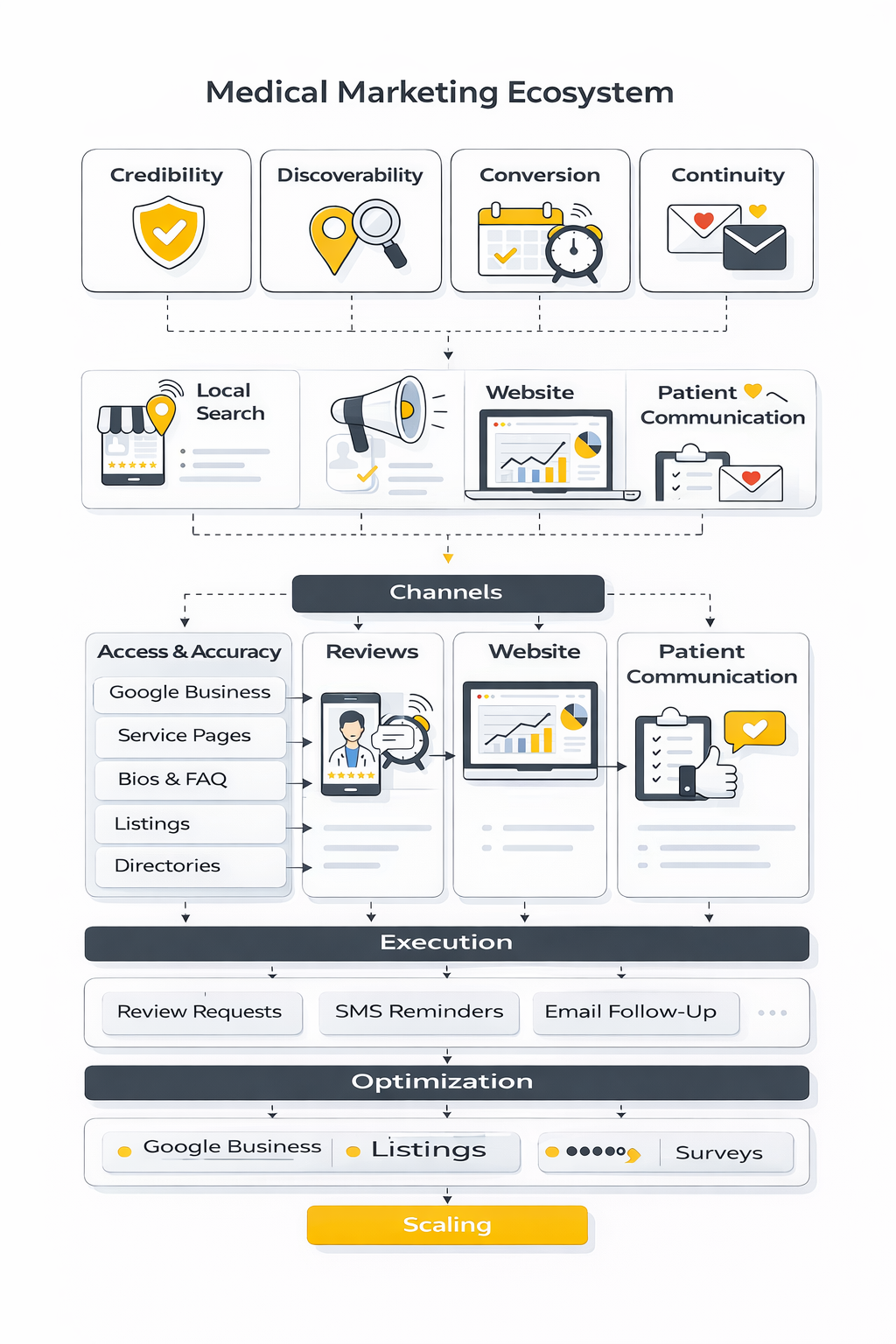 Before you scale further, it helps to see medical marketing as one connected system rather than a stack of isolated tactics. Search visibility, reviews, website clarity, scheduling, reminders, analytics, staff training, and compliance all influence each other. That is why the strongest practices stop thinking in campaigns and start thinking in systems.