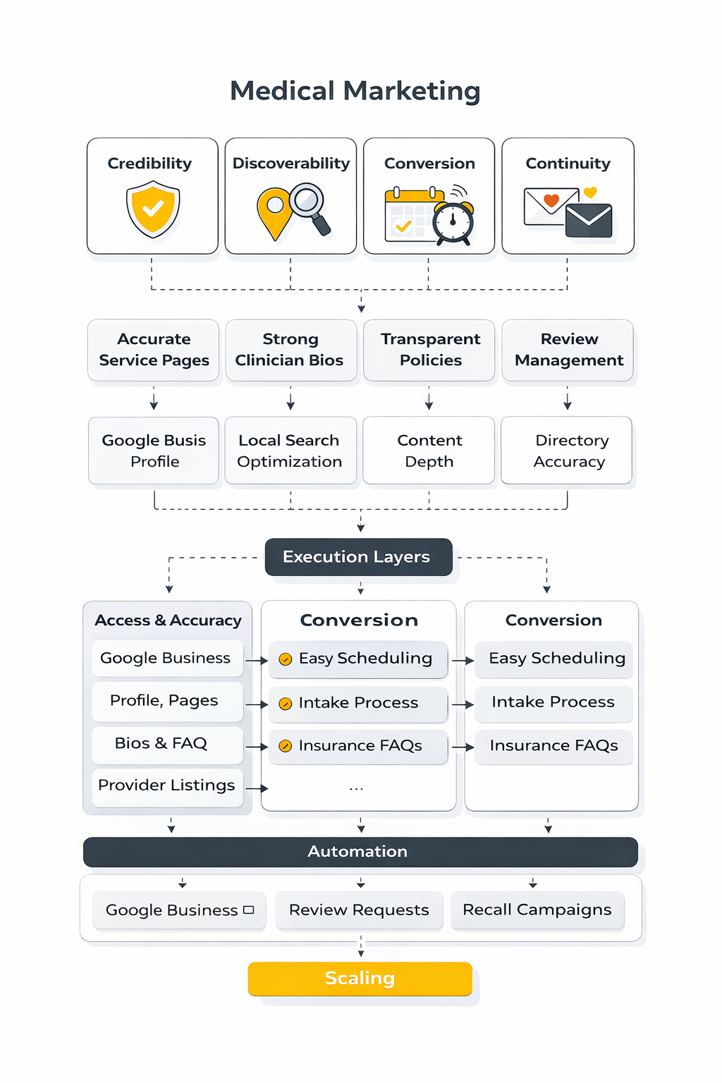 The cleanest way to think about medical marketing is as a four-part system: credibility, discoverability, conversion, and continuity. Credibility answers why a patient should trust you. Discoverability makes sure the right people can find you. Conversion helps them book without confusion. Continuity keeps the relationship active after the first visit so retention and referrals can grow naturally.