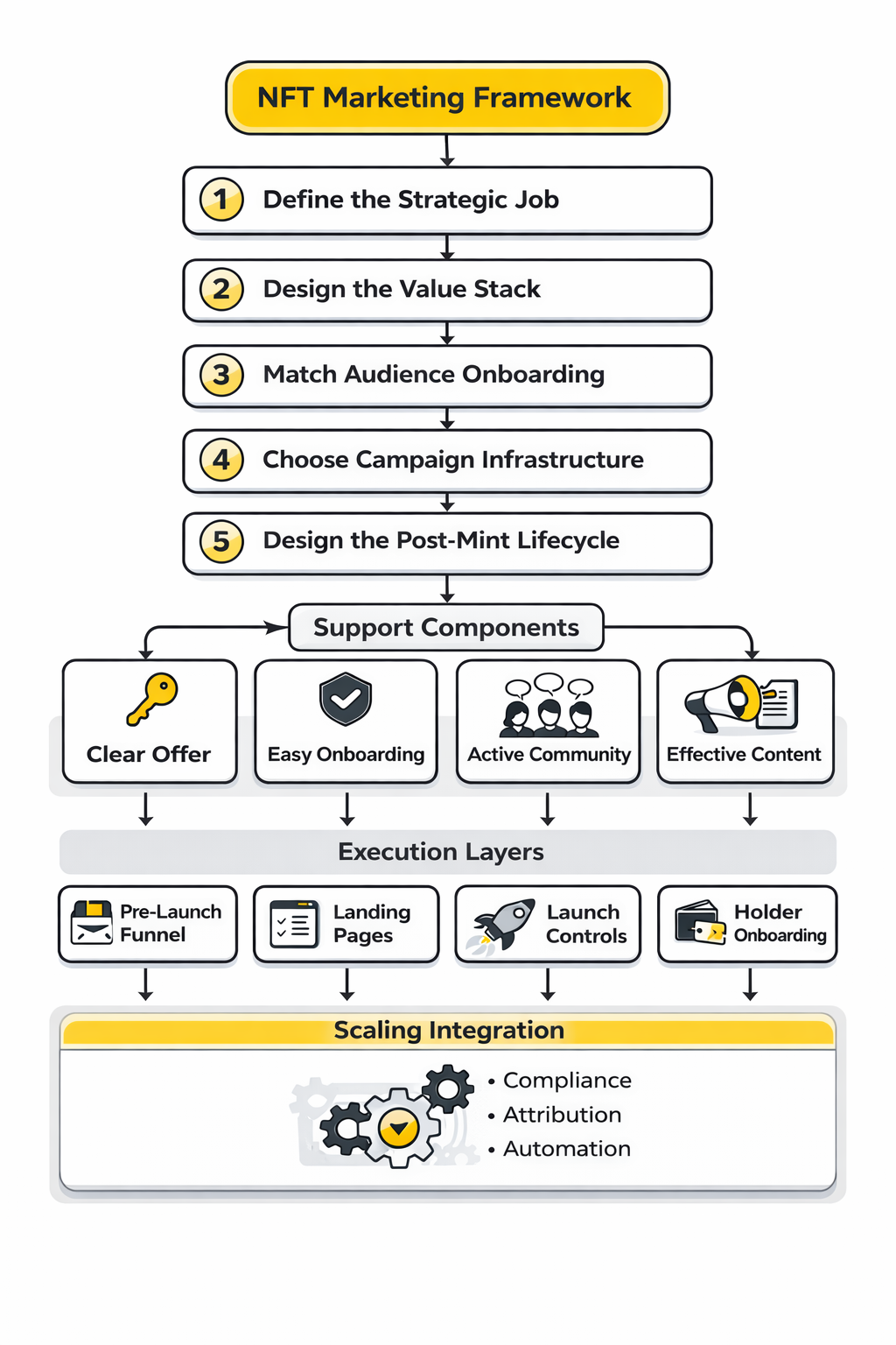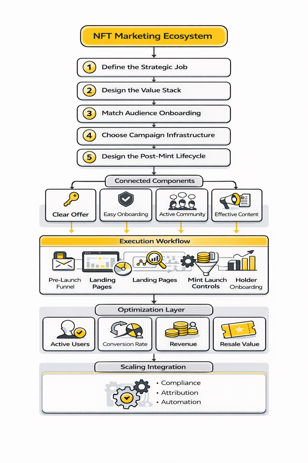 If you want NFT marketing to work, stop thinking in terms of launch tactics and start thinking in terms of systems. The right framework is not “build hype, mint out, celebrate.” It is “define the business role, design the offer, match the audience, choose the infrastructure, orchestrate the launch, and manage the lifecycle.” That sequence sounds less exciting, but it is exactly why it works better.