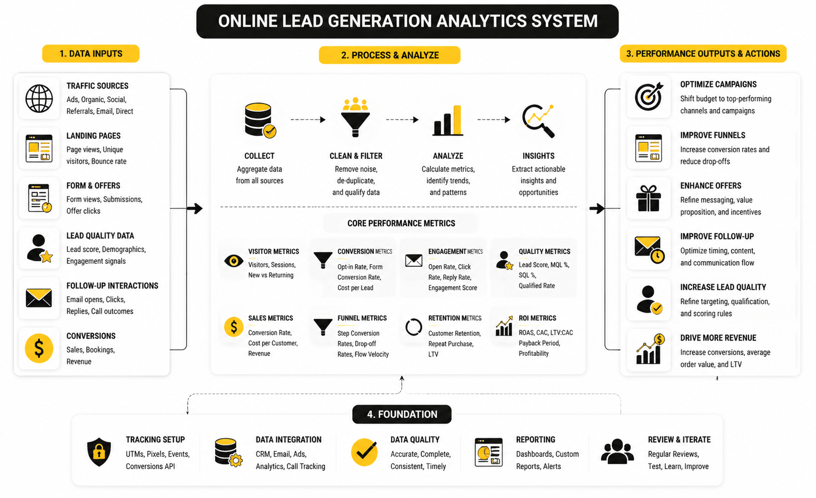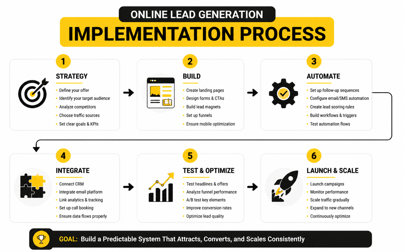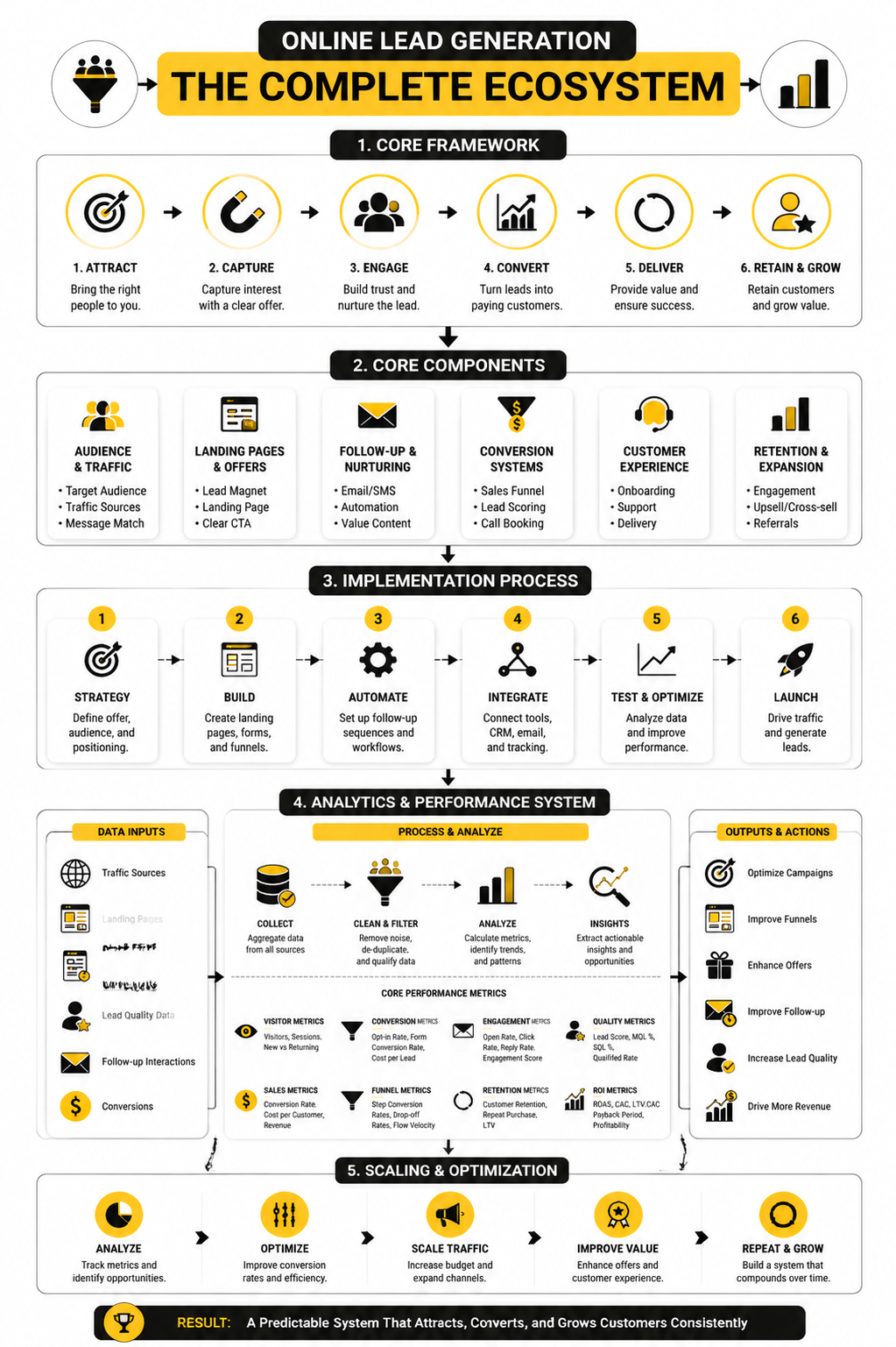 At this point, your online lead generation system is no longer a collection of tactics. It’s a connected ecosystem where traffic, funnels, automation, and data all work together.