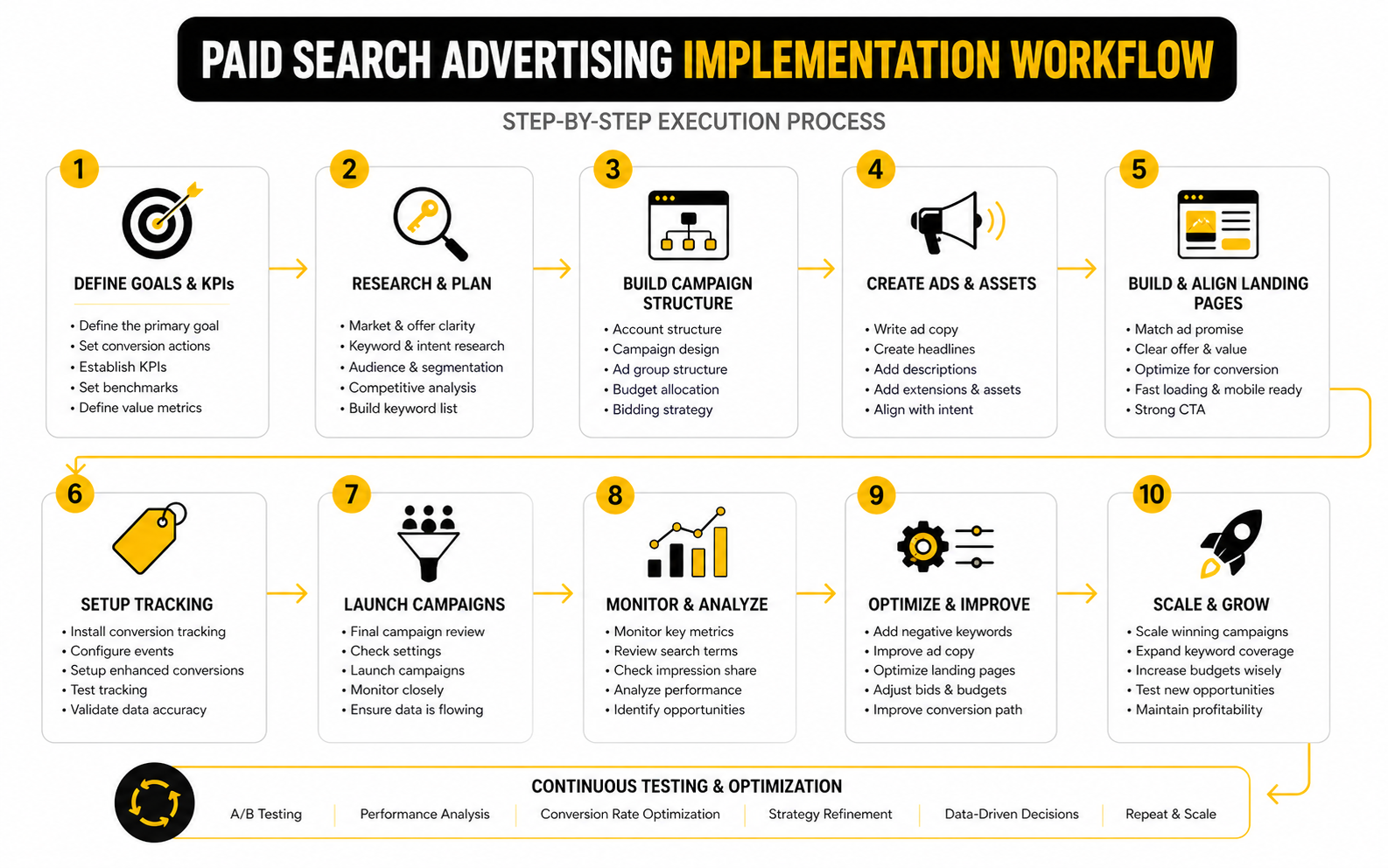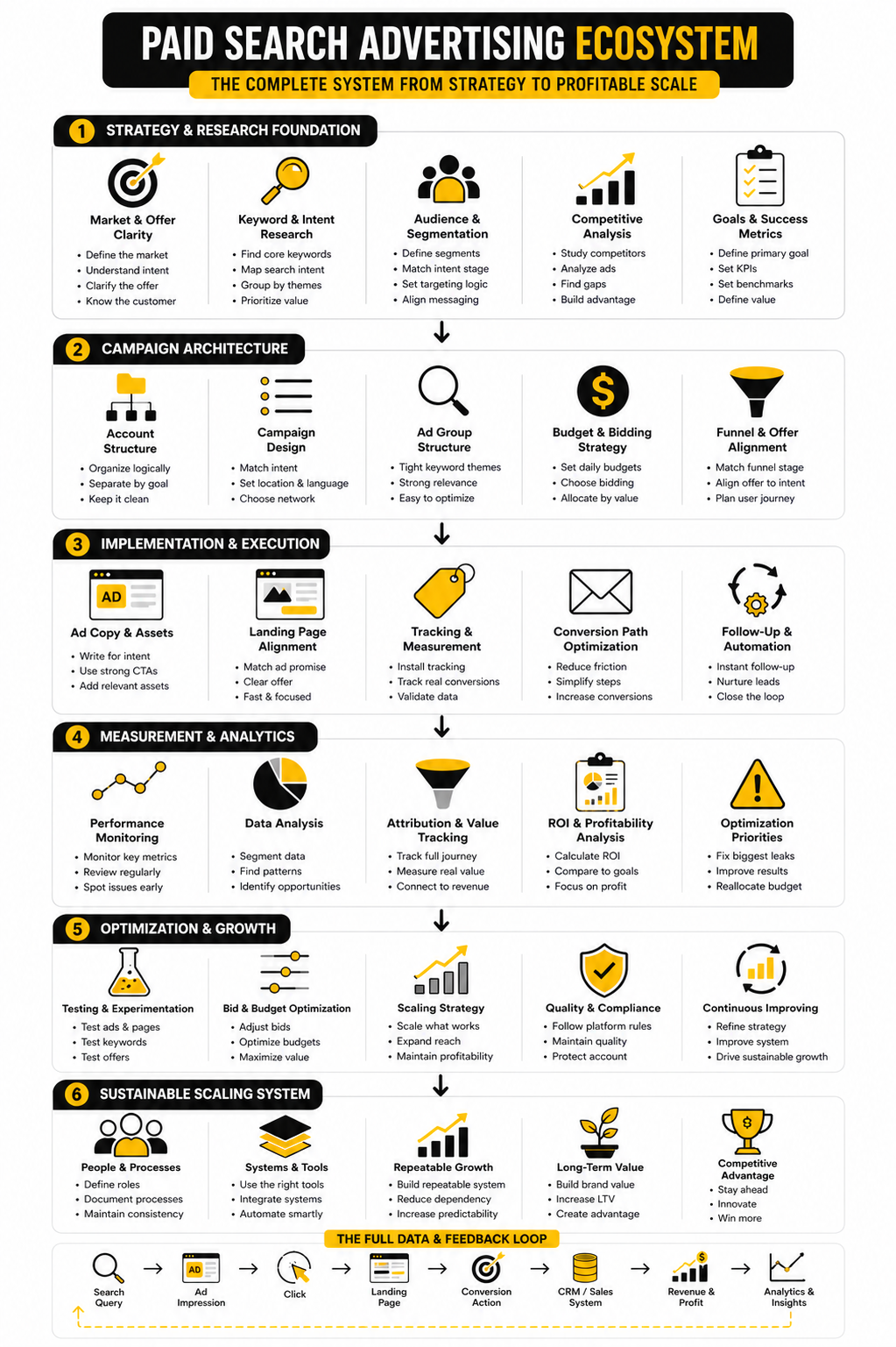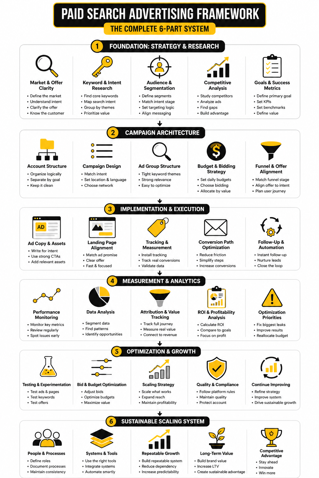 This is why the final stage of paid search is not just optimization inside the ad account. It is building a business system that can handle more intent without breaking. When the offer, tracking, landing page, sales process, and follow-up all improve together, paid search advertising becomes much more than a traffic source. It becomes a controllable growth channel.