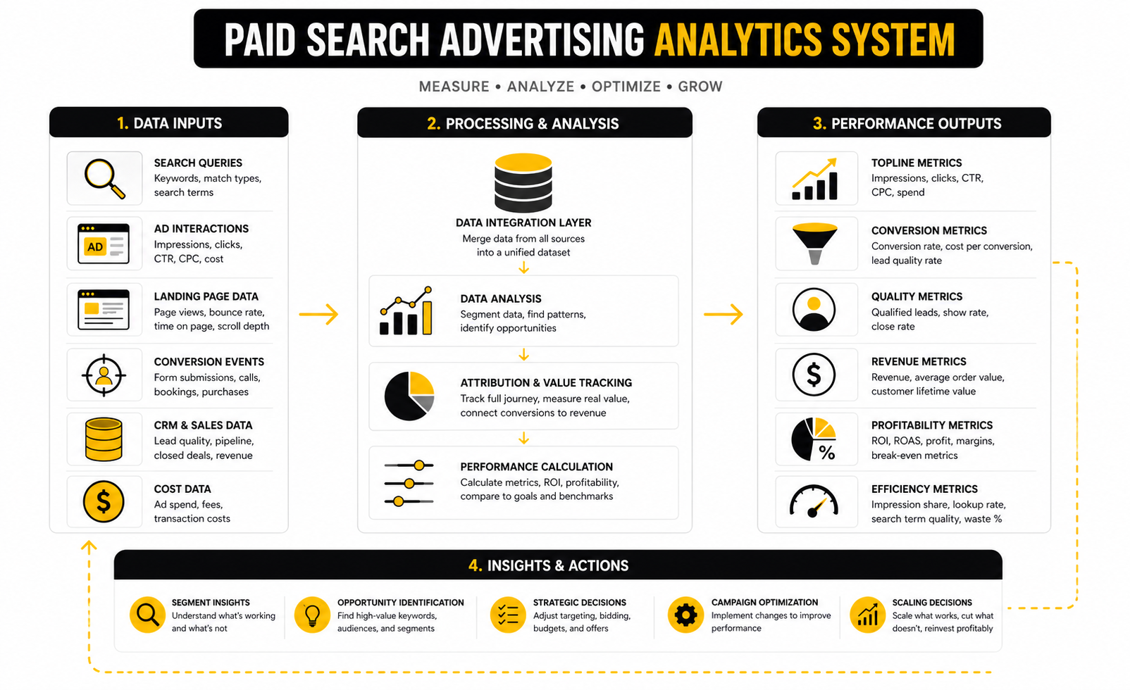 A mature paid search system connects search demand to business outcomes without losing context along the way. The search query explains the intent. The ad frames the promise. The landing page earns the conversion. The CRM or ecommerce system records what happened after the click. The reporting loop shows what should be improved next.