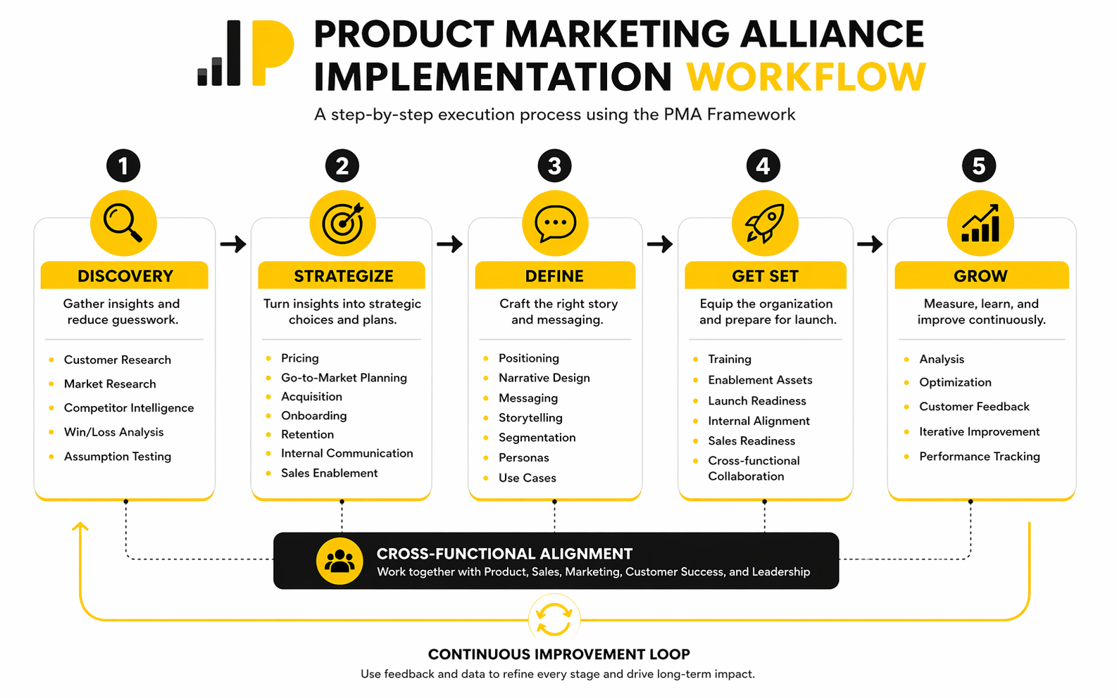 PMA also matters because it gives the discipline a common language. Its main site presents product marketing as a career path with community, resources, events, and certification, not just a vague job title with different expectations at every company. Its published framework moves from Discovery to Strategize, Define, Get Set, and Grow, which gives product marketers a clearer way to explain what they actually do and how their work connects to revenue, adoption, and retention.