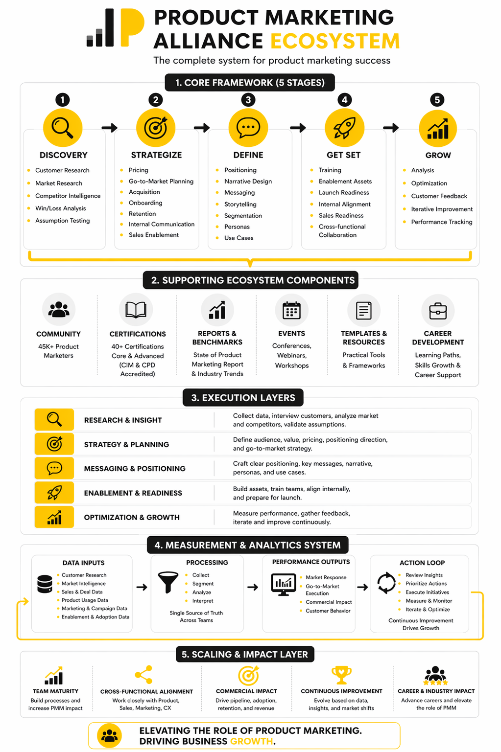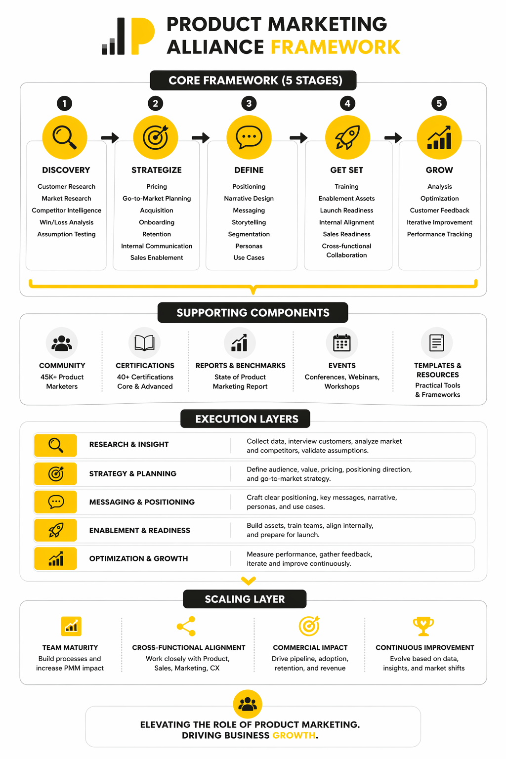 What makes this framework useful in practice is not that it is revolutionary. It is useful because it is broad enough to reflect real product marketing work, but still simple enough to teach, remember, and apply across teams. That balance is rare, and it helps explain why Product Marketing Alliance has turned the framework into the backbone of its current core certification and wider learning ecosystem.
