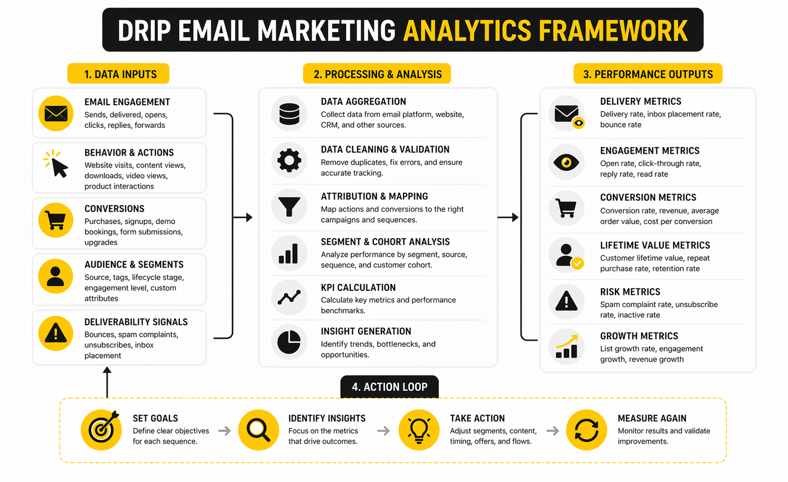 The cleanest way to measure drip email marketing is to break the journey into layers. The first layer is delivery and inbox visibility. The second is attention and engagement. The third is action. The fourth is commercial outcome. When the dashboard follows that order, diagnosis becomes much easier.