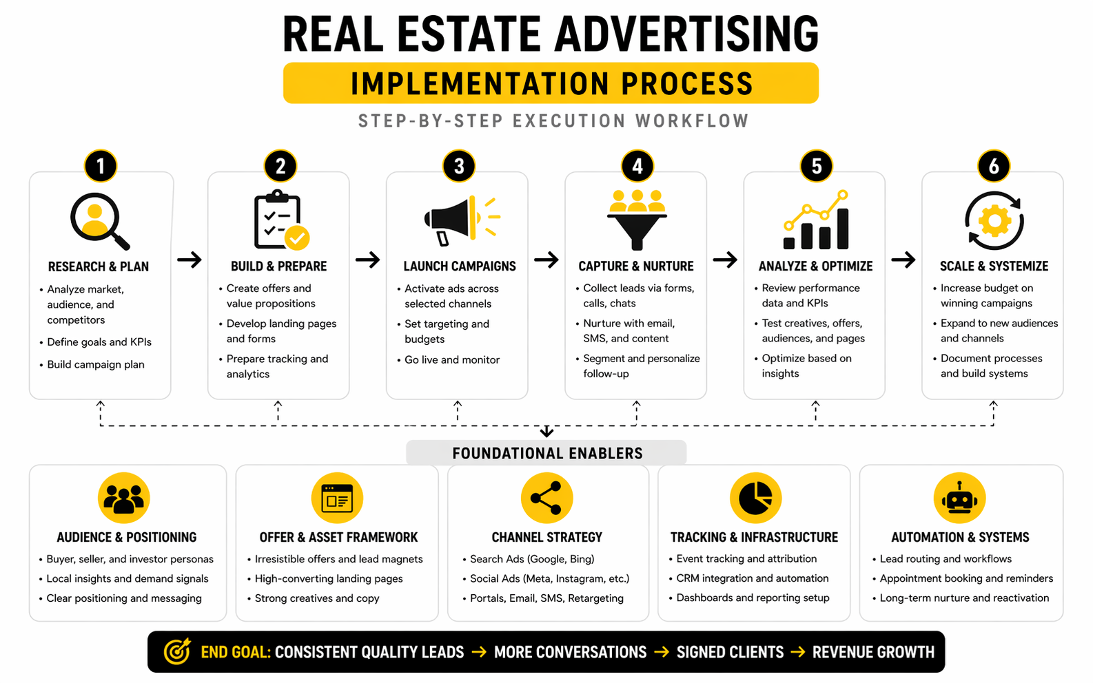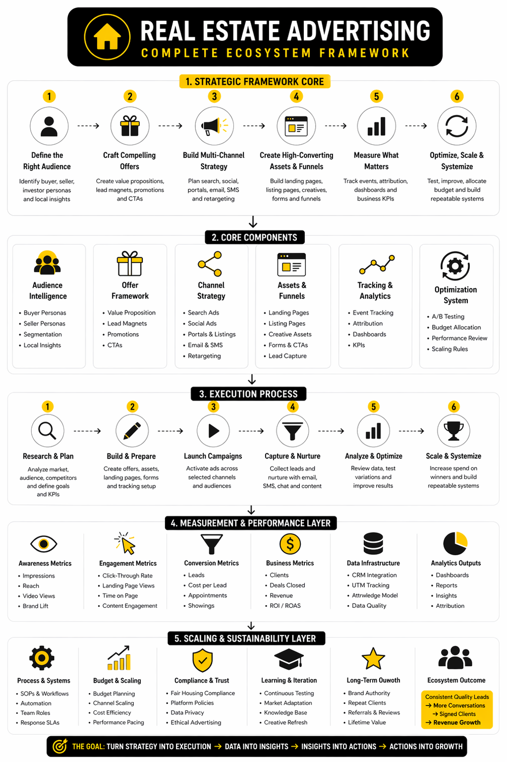 The framework is complete once all the pieces start working together. Real estate advertising is rarely won by a single ad, a single portal, or a single clever campaign. It performs best when positioning, creative, channel mix, measurement, follow-up, and compliance are all treated like one operating system instead of separate tasks being handled ad hoc.